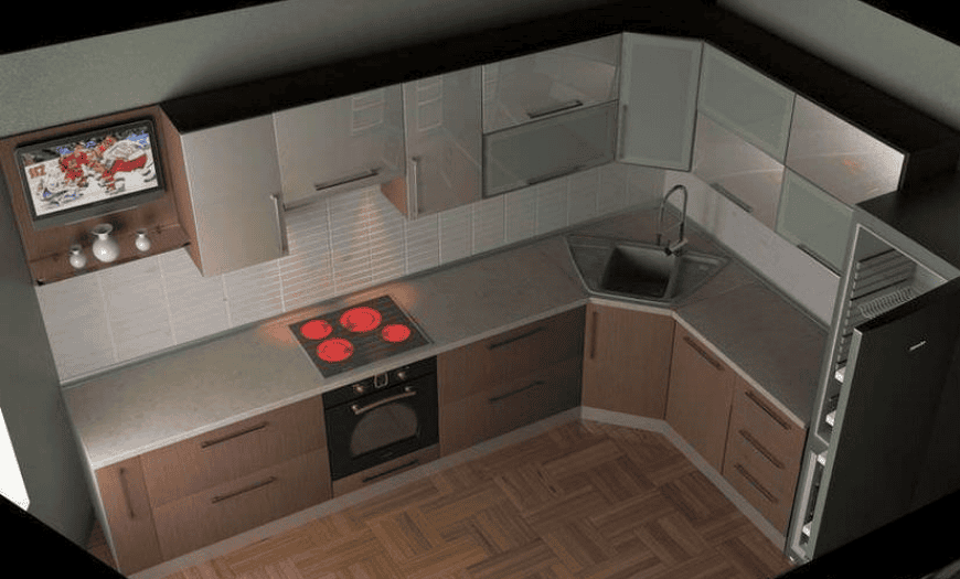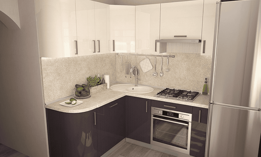 Как правило, в хрущевках площадь кухни не больше 7 кв.м. Поэтому угловой вариант расстановки будет самым оптимальным.