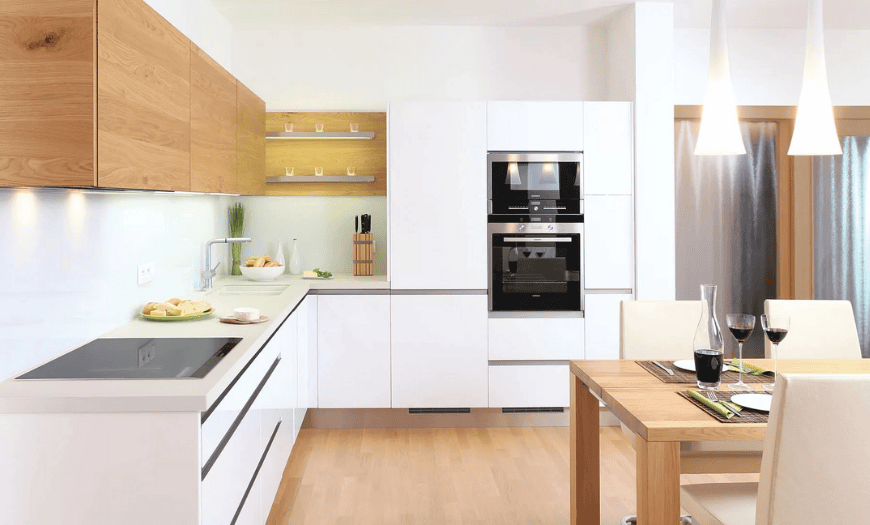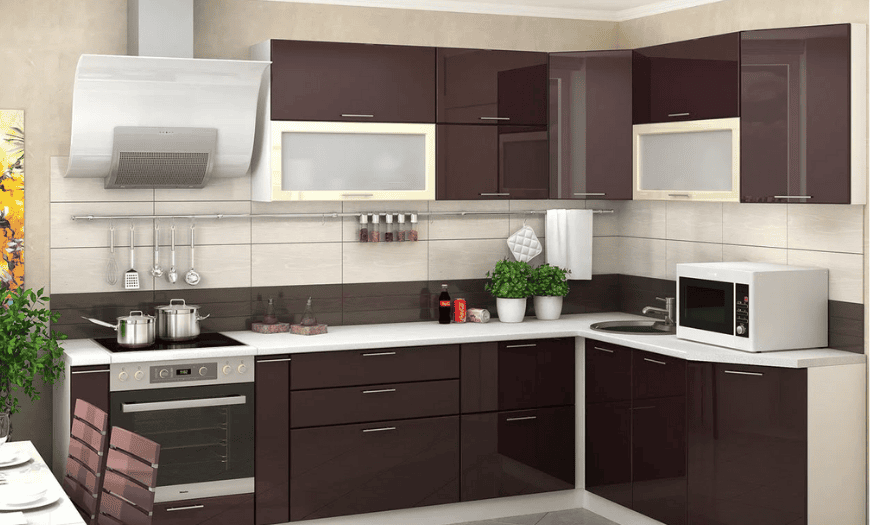 При такой оформлении шкафы располагаются под прямым углом. Подобный вариант подойдет для небольших или смежных кухонь. Преимущества Г-образной угловой планировки в 2023 году: