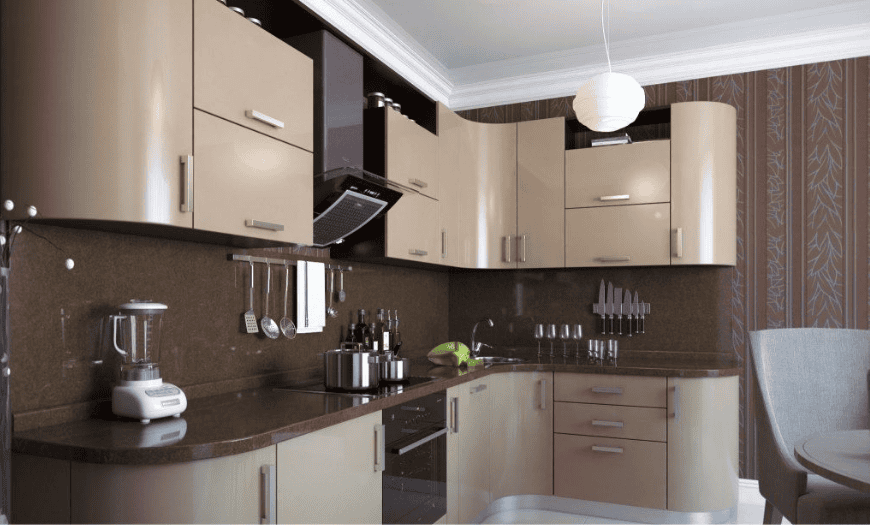 Первое, на что стоит обратить внимание, это цвет. В угловую кухню выбирайте светлые гарнитуры белого, бежевого, персикового, розового, мятного, нежно-голубого тонов