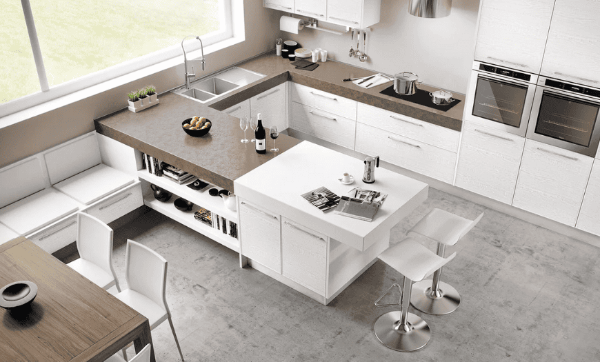 Угловая кухня, имеющая остров, подойдет для помещений размером до 15 кв.м. Также это хороший способ зонирования пространства. Такая планировка имеет свои плюсы: