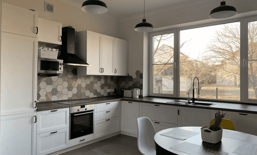Кухня с белым гарнитуром в этом стиле обычно имеет гладкие фасады. Распространены чёрно-белые сочетания: это может быть чёрная плитка на полу и фартуке либо тёмная столешница.