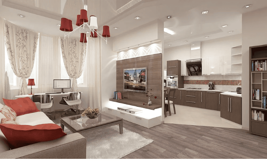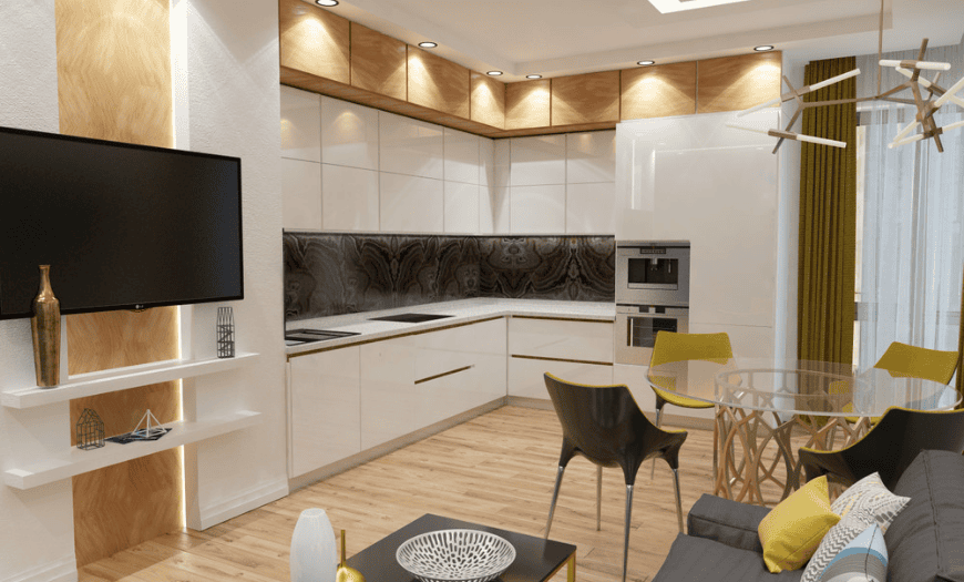 В 2023 году особенно популярными становятся квартиры формата «евродвушка» и «евротрешка». Их особенность — это совмещение зала и зоны готовки. Поэтому современный дизайн угловой кухни-гостиной будет особенно востребован. Но такая планировка также имеет свои плюсы и минусы.