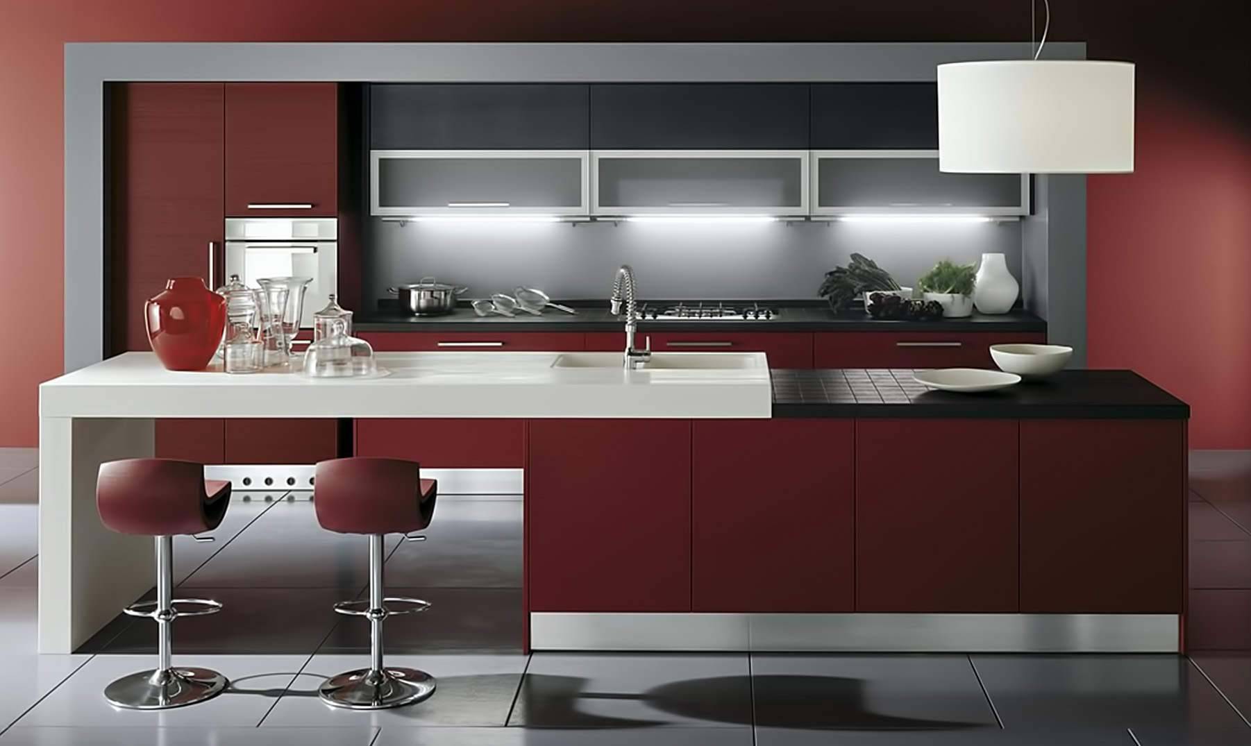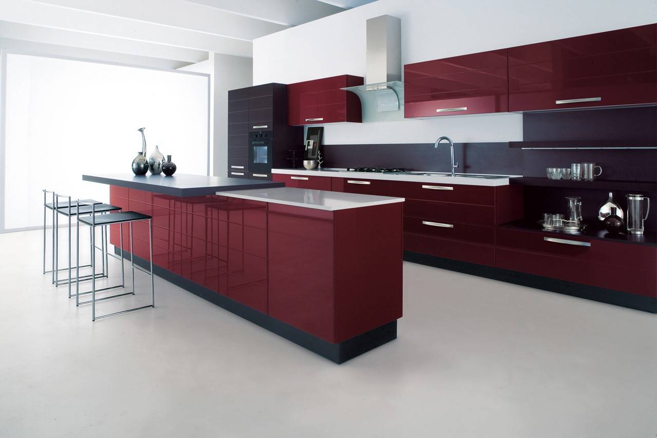 Минимализм – очень лаконичное стилевое направление. А бордовый цвет поможет разбавить его, сделать живее. Если площадь кухни достаточно велика, можно поэкспериментировать с оттенками серого. Особенно выгодно подчеркнут геометрию помещения тёмный графитовый и нейтральный пепельный тона. Сочные бордовые оттенки сделают кухню по истине роскошной.