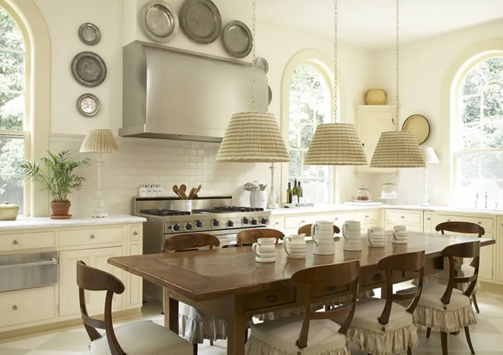 - По центру кухни находится только люстра, а возле обеденной зоны нет подсветки. Необходимо использовать дополнительные источники освещения не только над рабочей поверхностью, но и над обеденным столом — например, торшеры или настенные бра.