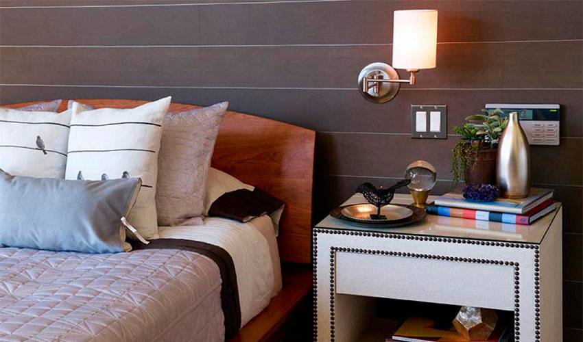 - Высота спинки кровати. Светильник должен располагаться в 20-30 см над спинкой. Однако здесь речь идет о стандартном изголовье. Иногда эта деталь настолько высока, что лампу не получается установить даже на 160-сантиметровой высоте. Поступить следует так: подвесить светильник чуть выше края спинки, оснастив его шнурком. Можно не вешать лампу выше кровати, а вмонтировать ее прямо в спинку.