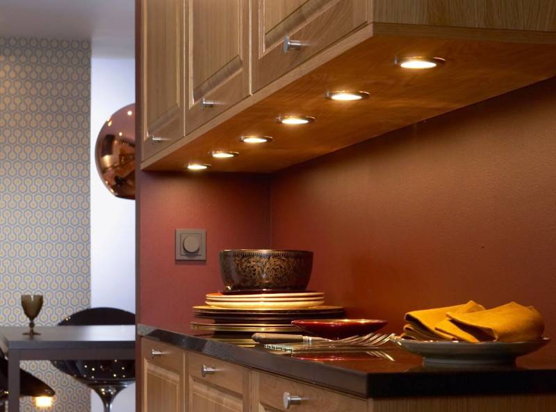 В рабочей зоне обязательно используют подсветку под навесными шкафами или на потолке в виде точечных спотов или светодиодной ленты. Здесь также будет уместен один светильник над обеденным столом или несколько аккуратных подвесов. Они должны быть компактными, но не мелкими. В последнем случае недостаток лишь подчеркнется.