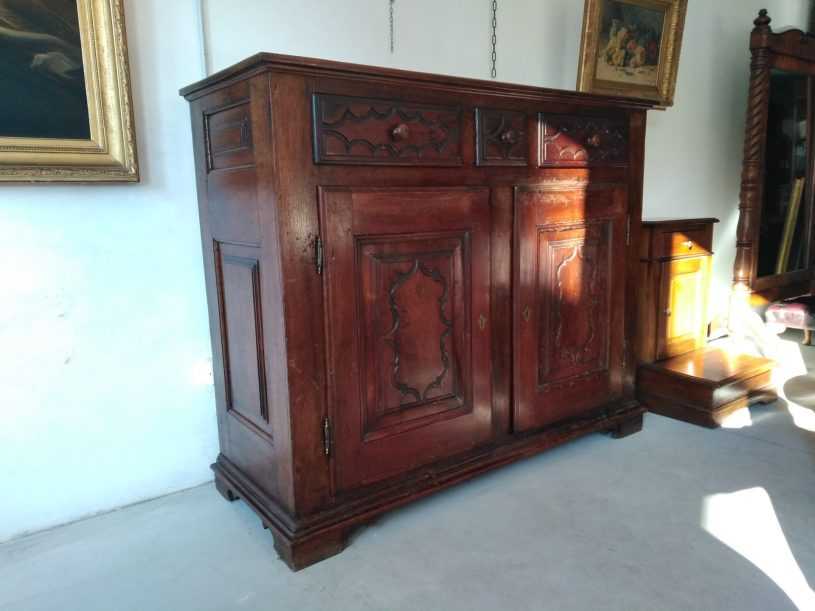 Изначально буфет был разделен на несколько отделений и снабжен дверцами с замками. Верхнюю часть от нижней отделял стол с нишей. Такой вид оказался самым удобным и рациональным: верхние полки с дверцами – для посуды, выдвижные ящики – для столовых приборов, нижние закрытые полки – для более массивной кухонной утвари. В таком виде буфет дошел до наших дней.