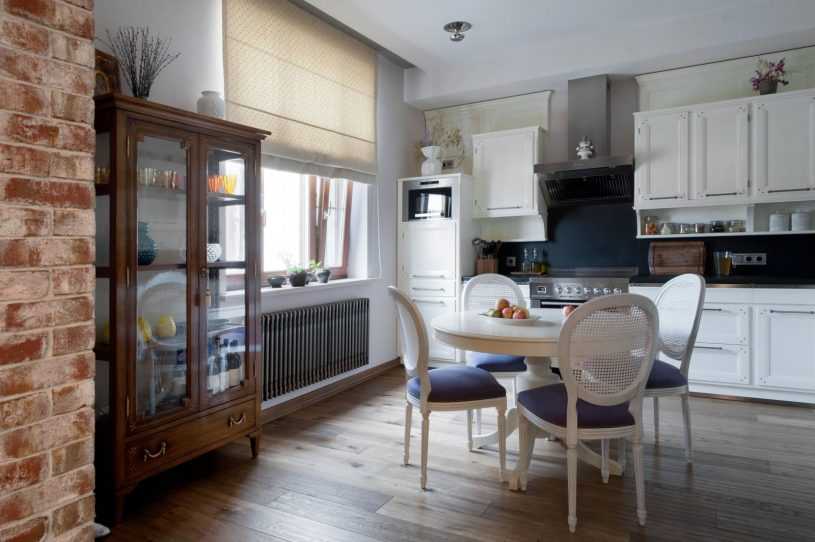 В эклектичном интерьере органично смотрится угловой буфет закрытого типа