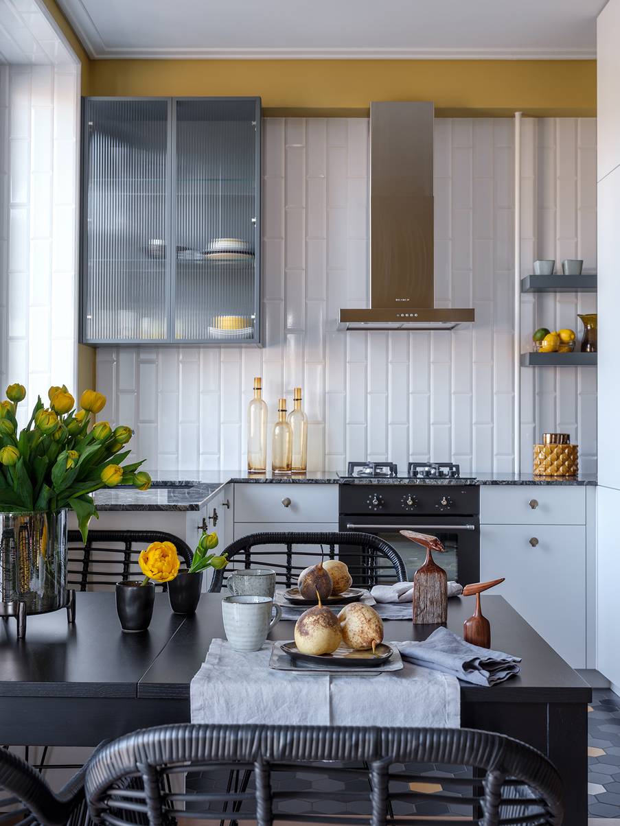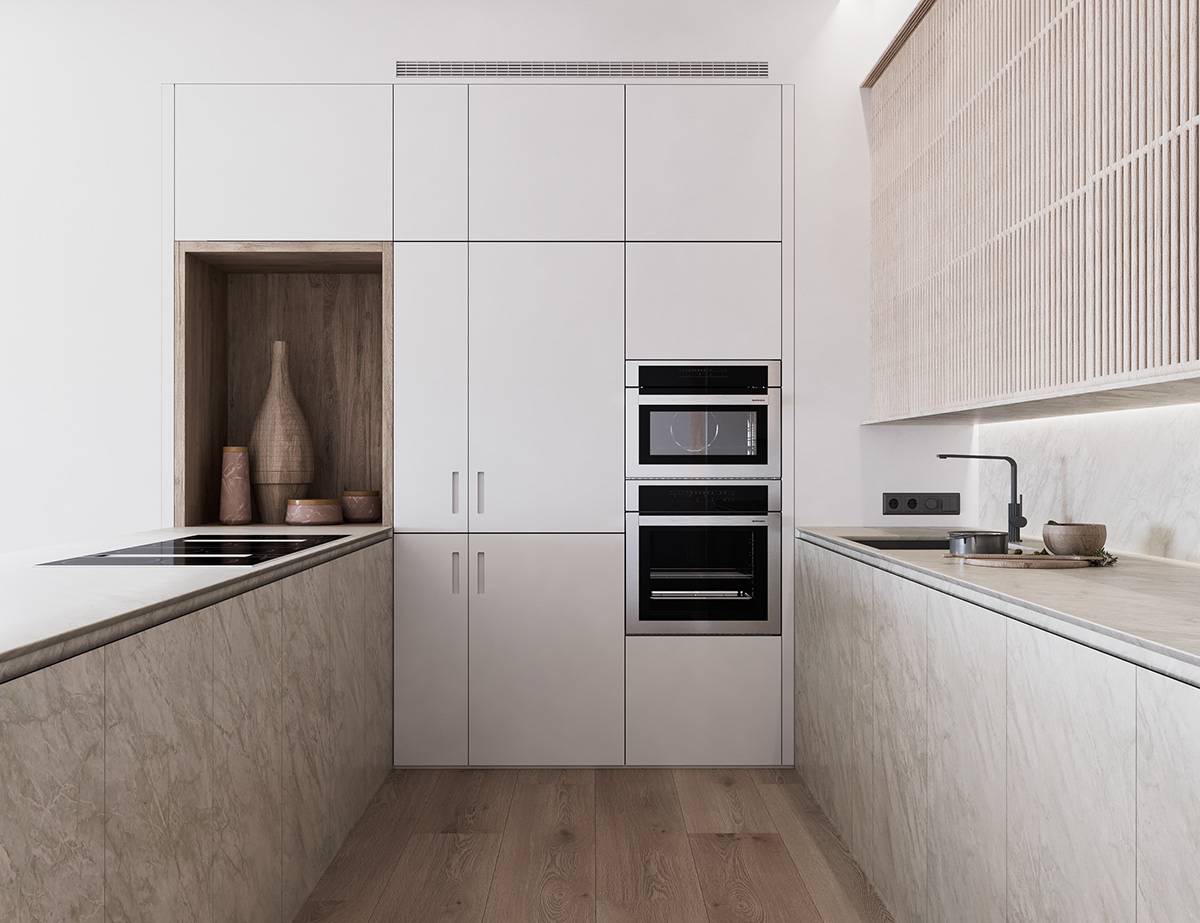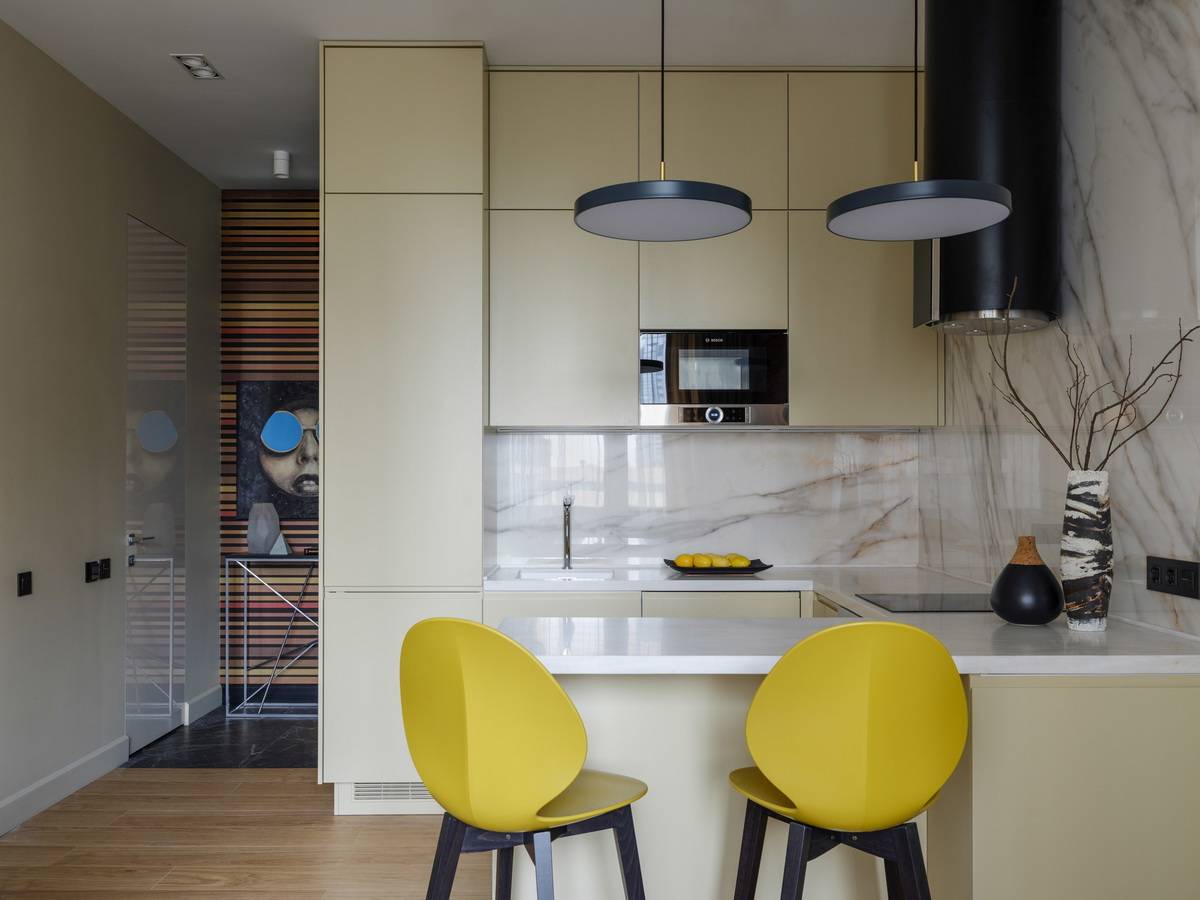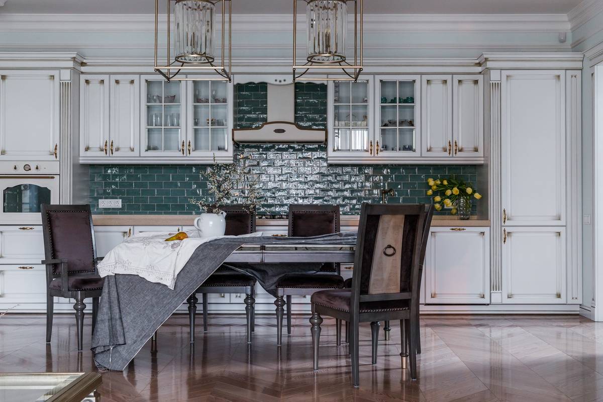 Прекрасная планировка кухонного гарнитура в форме буквы Г, интерьер в светлой спокойной оттеночной палитре и утонченная меблировка завершает образ.
