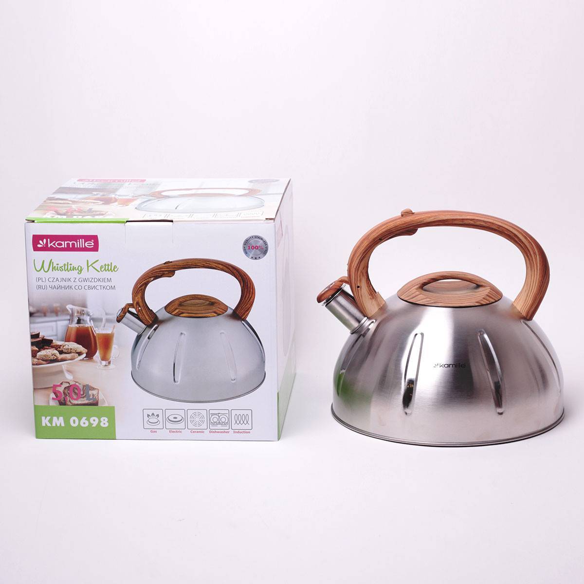 Эта популярная модель станет отличным решением для большой семьи. Вместительность – 5 л. Качество сборки выше любых похвал. Продукт от проверенного временем немецкого концерна, который пользуется заслуженным спросом среди отечественных потребителей. Держатель округлый. Материал изготовления – термостойкий. Рычажок для свистка сделан из металлического сплава. Покрытие матовое, немного шероховатое.