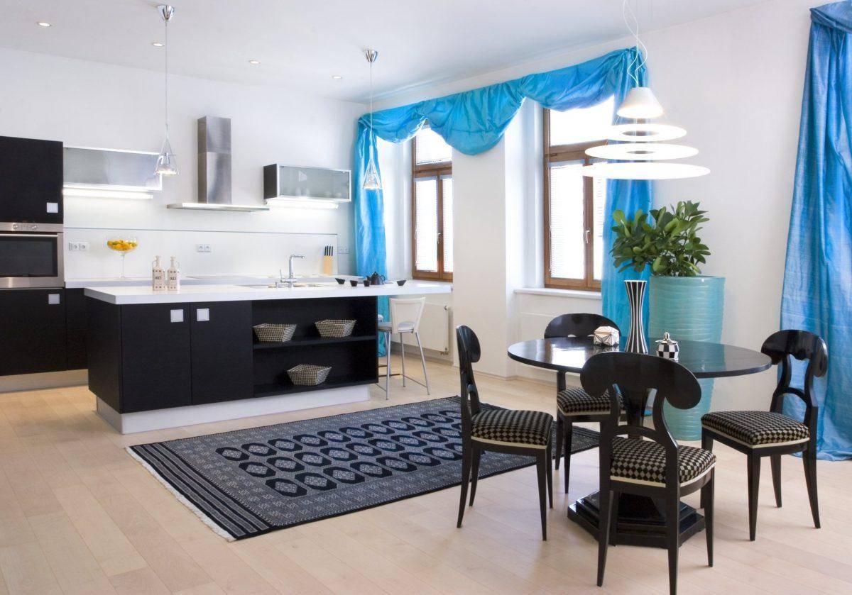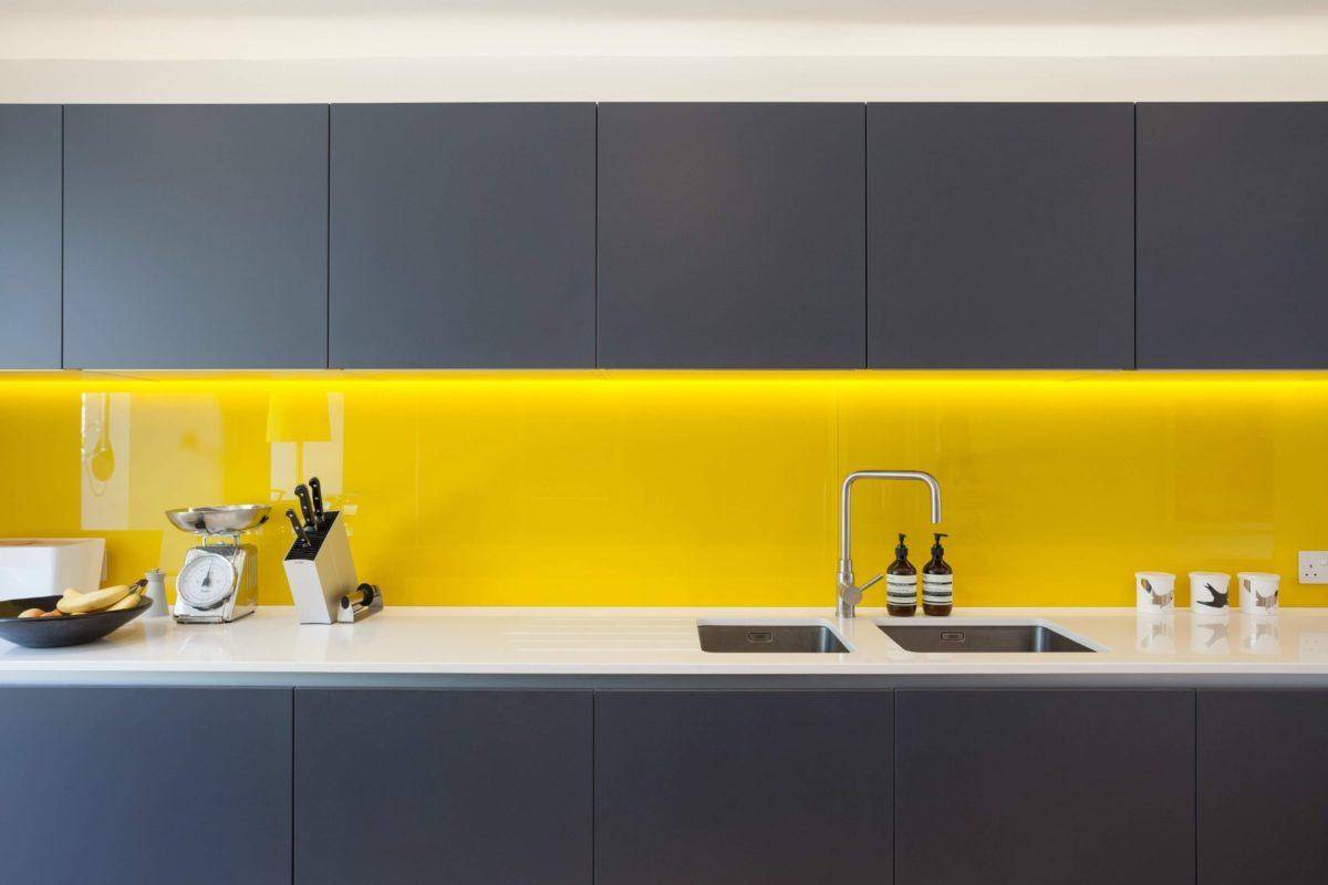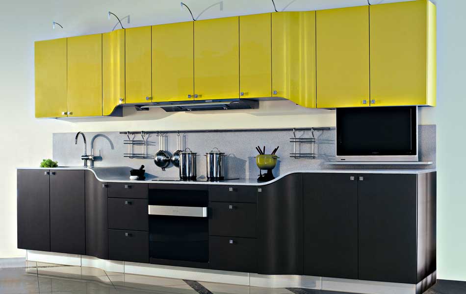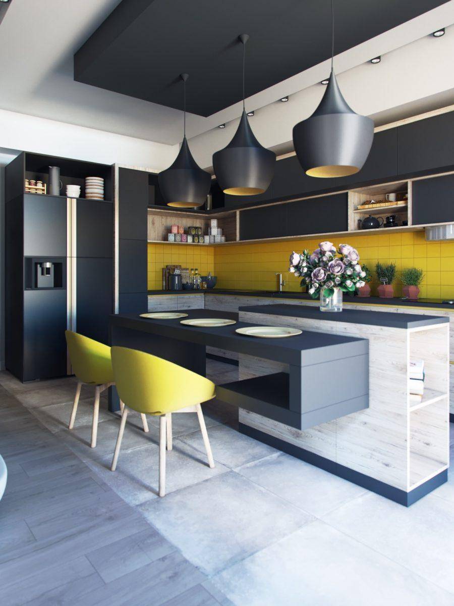 Для чёрной кухни акцентные цвета — контрастные к тёмному оттенки. Это все светлые тона с чистым, неразбавленным тоном. Например, белый, жёлтый, голубой и т. д.
