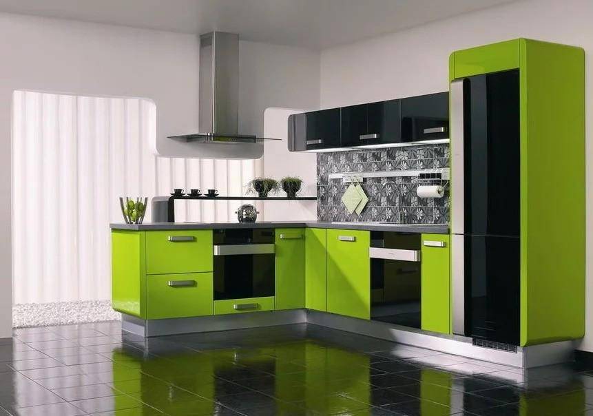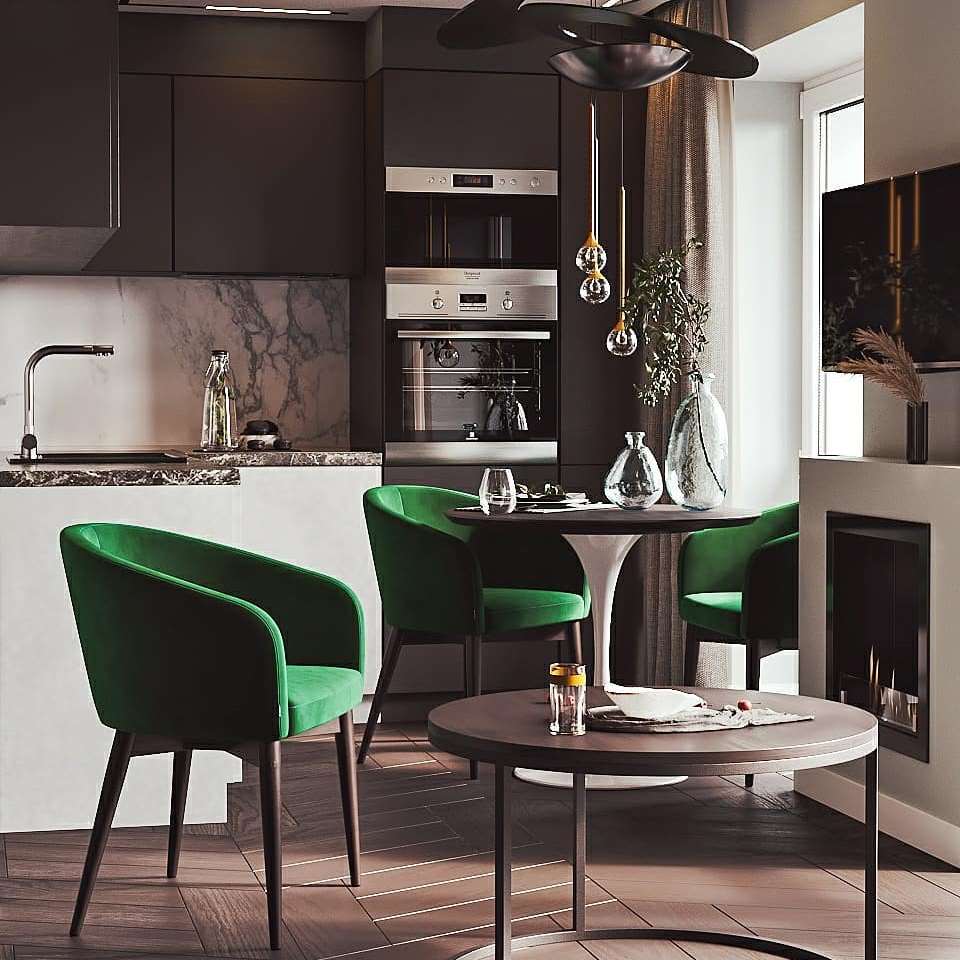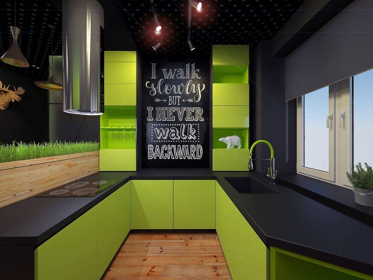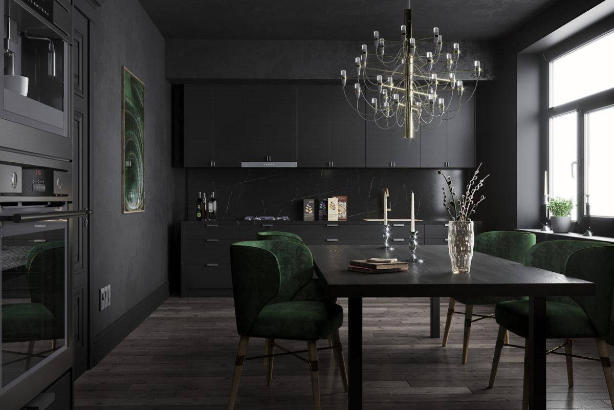 Для чёрного гарнитура идеален дополнительный цвет, который используется в проекте. Например, травянисто-зелёный.