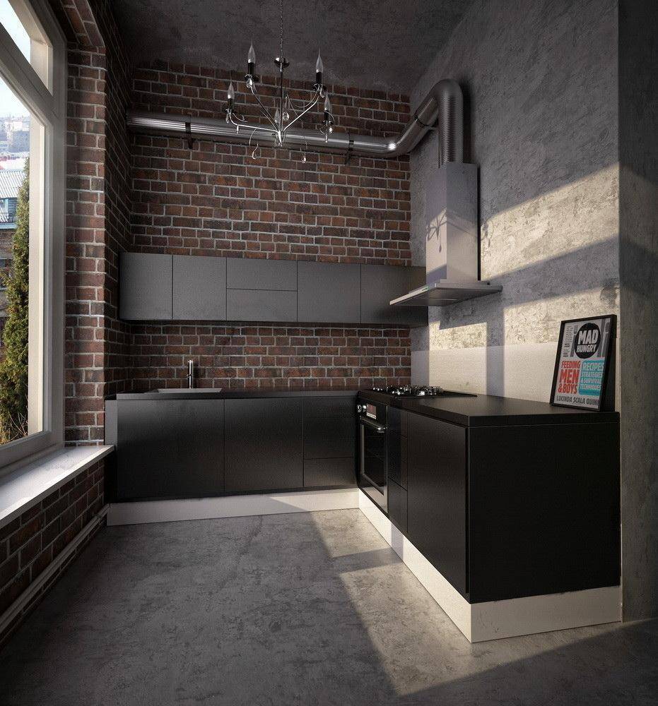 В чёрной кухне лофт в качестве акцента можно использовать кирпичную кладку на одной из стен. Или заменить ей фартук.
