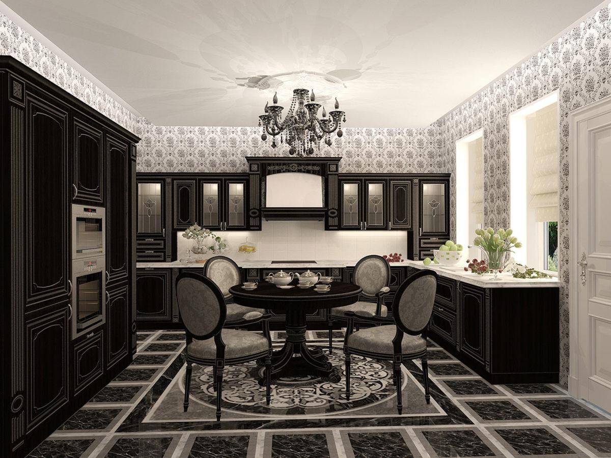 Чёрная кухня в классическим стиле — это феерия роскоши, элегантности и благородства. Тёмные тона в сочетании с классикой раскрываются по-новому. Это смотрится не мрачно, а возвышенно и утончённо.