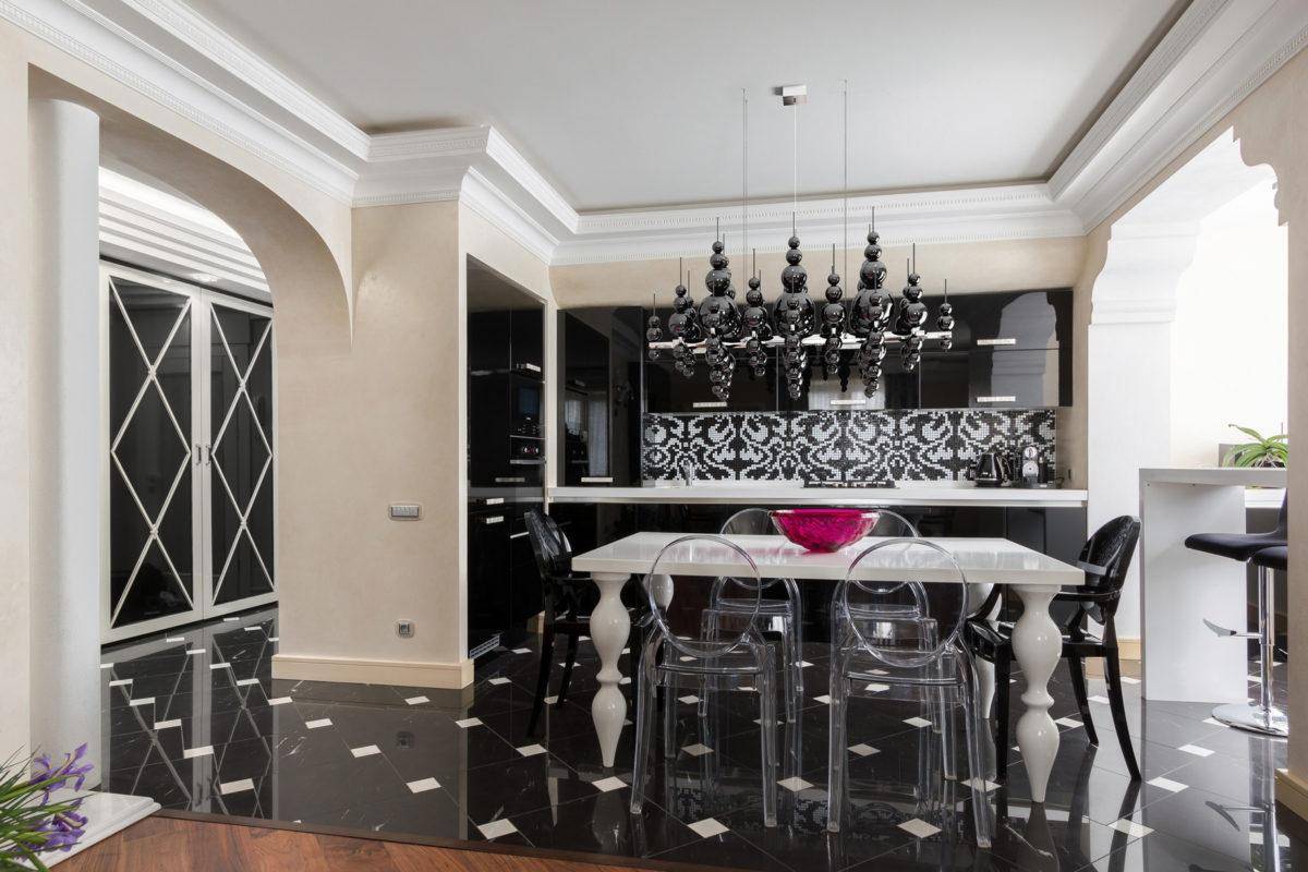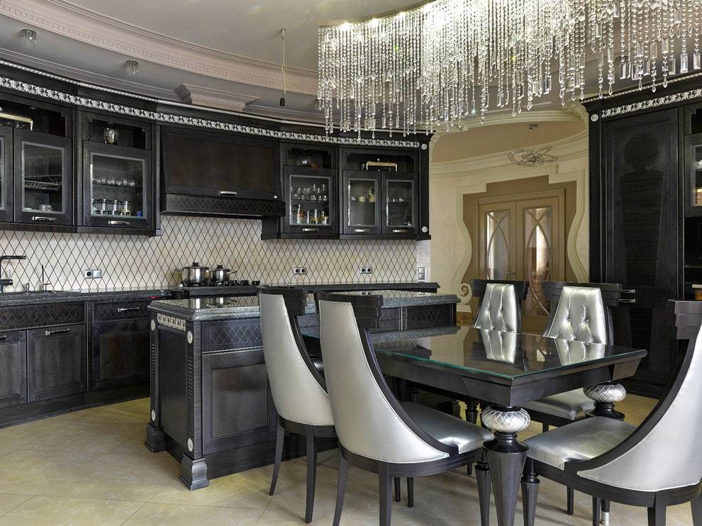Мягкие линии в мебели и строгие формы в декоре — основа стиля. Чёрно-белая или коричневая кухня в арт-деко смотрится лучше всего. Добавить изящества можно с помощью классической люстры и неброского орнамента на фартуке.