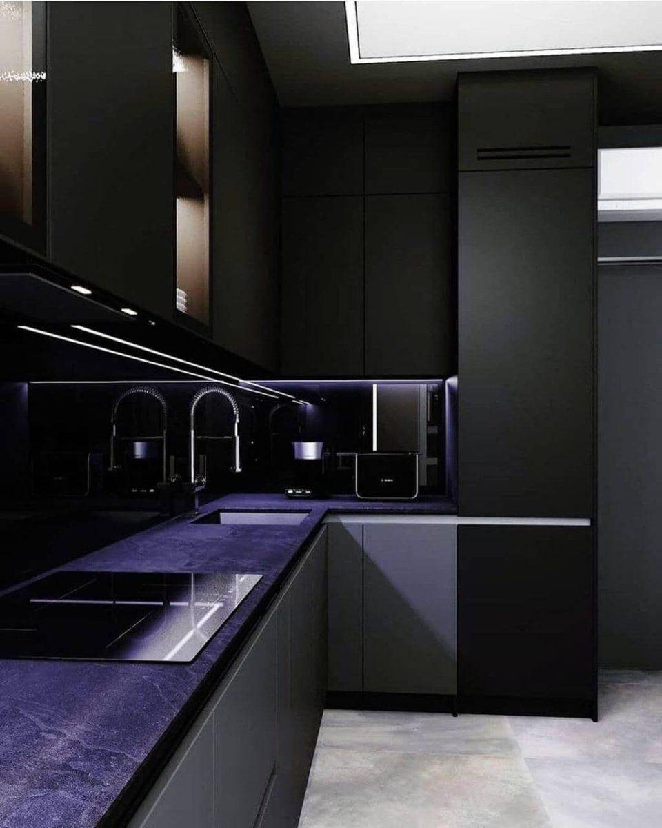 - Визуальное уменьшение комнаты. Это правило работает, если кухня полностью чёрная. Но при добавлении акцентных цветов и игры с фактурой можно достичь противоположного эффекта.