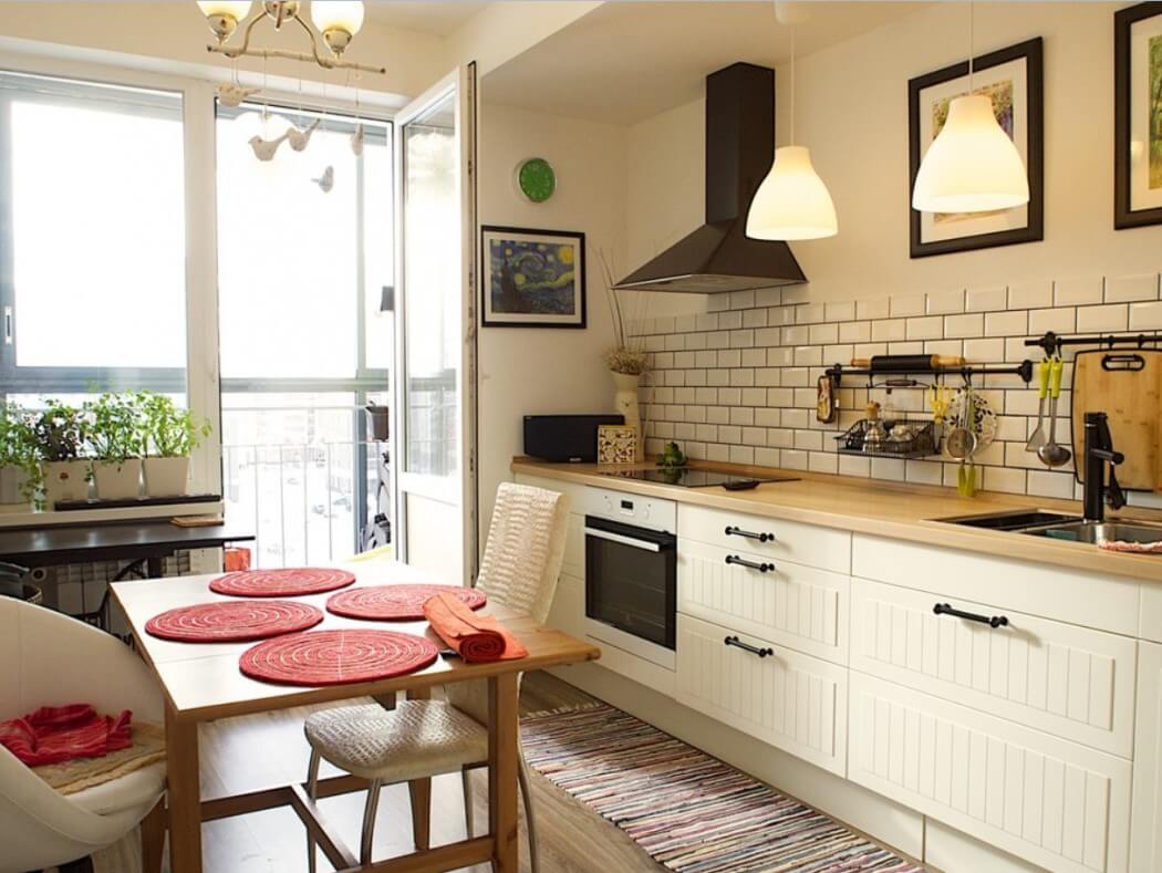 Еще один вариант — утеплить балкон или лоджию, если таковые есть на кухне. Эта добавочная площадь станет вместительным хранилищем для кухонных принадлежностей, что позволит безболезненно отказаться от верхнего ряда мебели.