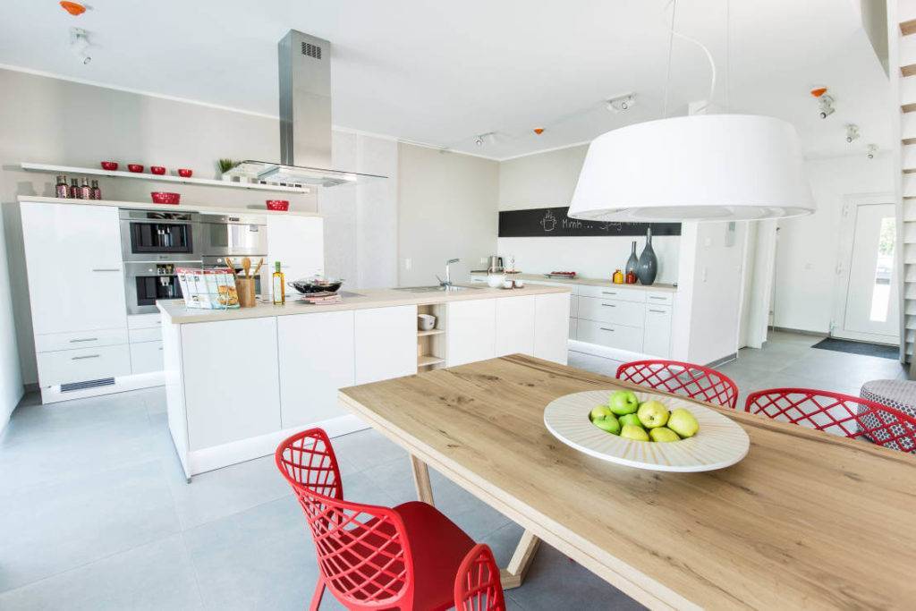 При отсутствии навесных шкафов может возникнуть проблема хранения некоторых необходимых вещей, что можно решить путем увеличения высоты и глубины напольных шкафов, просчитав размеры кухонных фасадов. Но при этом поставить на такую кухню обеденный стол больших размеров может не получиться из-за нехватки места.