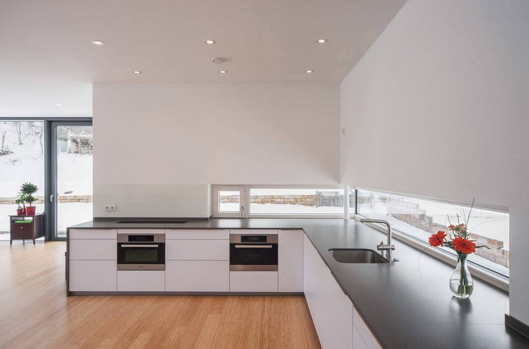 - У окна. Когда крупная техника спрятана в углу, кухня выглядит более просторной и свободной. Двери для удобства эксплуатации должны открываться к оконному проему.