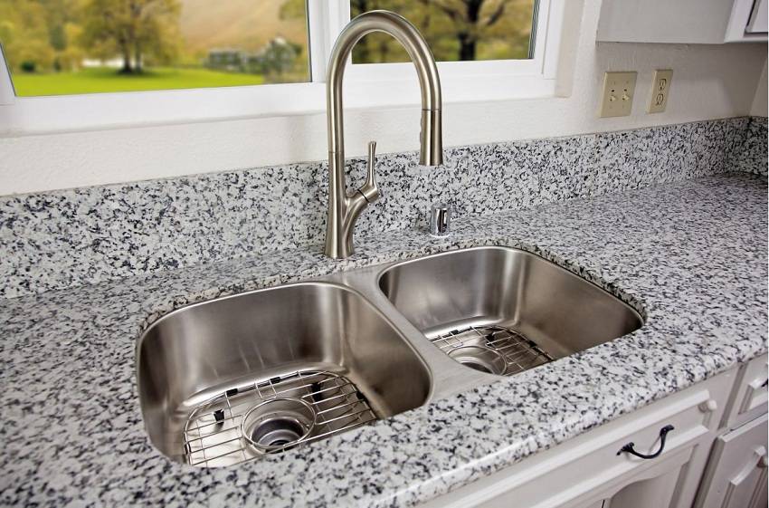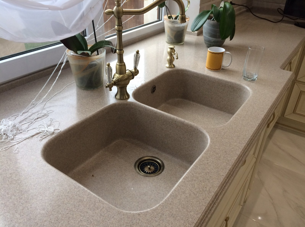 Композитные раковины (мойки из искусственного камня) делают из гранитной крошки и акриловых компонентов. Считаются самыми дорогими: их цена начинается от 200 долларов. Однако высокая стоимость окупается их плюсами: они очень прочные, легко моются и не боятся активной бытовой химии. Кроме того, низкий уровень шума делает работу с ними очень комфортной. Расцветка может имитировать различные типы натурального камня, но все же не отличается особым разнообразием.