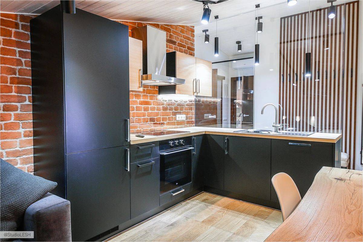 Лофт. Для индустриального интерьера характерны грубые методы декора. На фото, проект кухни разработанный студией «LESH», здесь абсолютно чёрный современный гарнитур идеально вписался в мансардную кухню с красной кирпичной стеной.