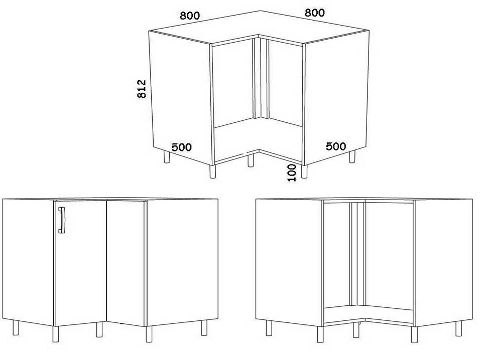 Бока нижнего углового шкафчика остаются константой – 500 х 712 мм, при условии, если они не попадают на коммуникации или другие важные объекты.