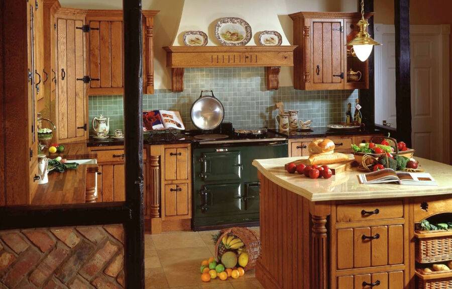 Дерево и белый цвет — это всегда выгодное сочетание. В этой кухне дерева много: это и обшивка фартука деревянными панелями, и вытяжка, и деревянные аксессуары. Дополняет стиль кантри соответствующий декор: медные приборы, деревянные доски, керамика и живые цветы.