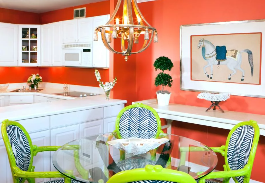 Этот оттенок неплохо подходит для кухни, но требует осторожности. Если слишком сильно переусердствовать, есть риск получения слишком агрессивного интерьера