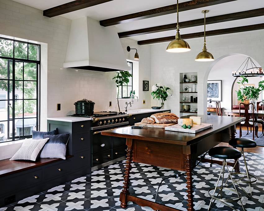 - Уложенная на полу по диагонали черно-белая квадратная плитка зрительно расширит объем кухни.