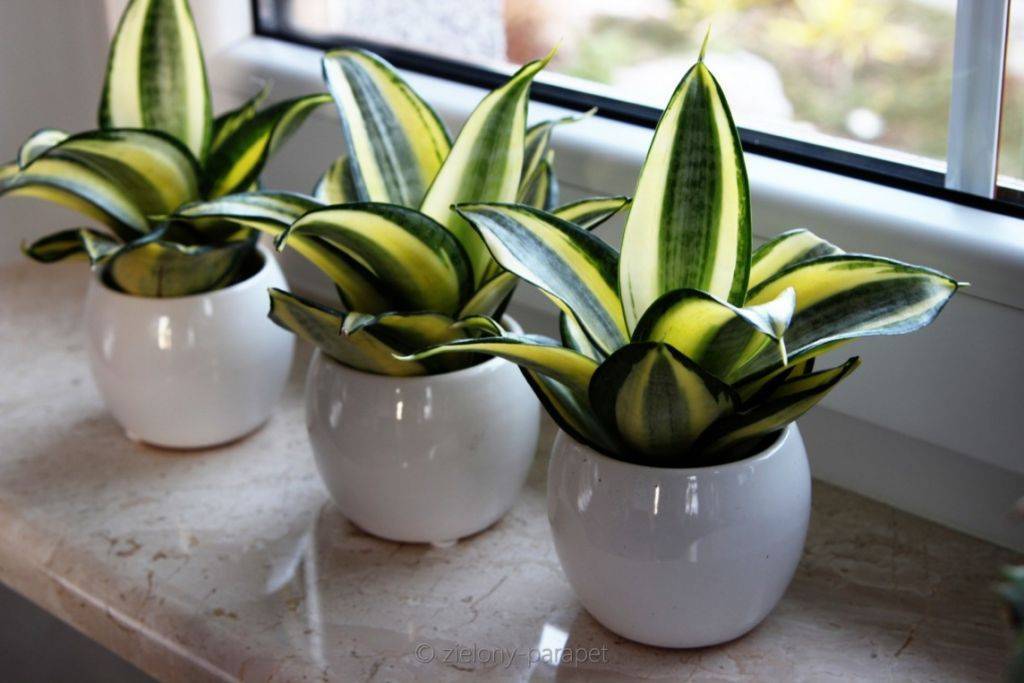 - Сансевьера. Относится к виду Спаржевых, небольшое растение с очень плотно прижатыми друг к другу листьями больше, по внешнему виду, напоминающих пучок.