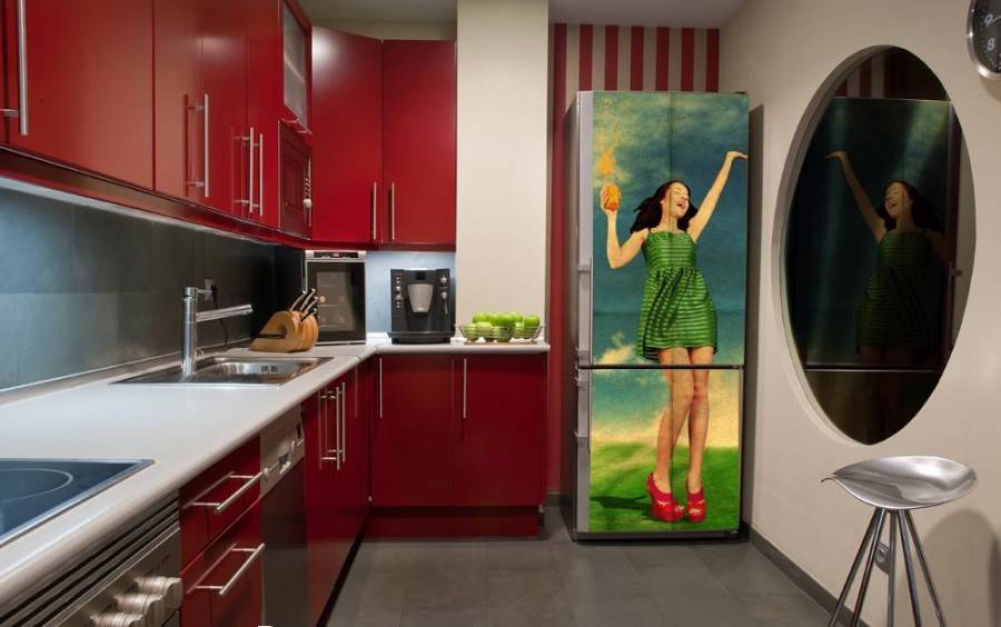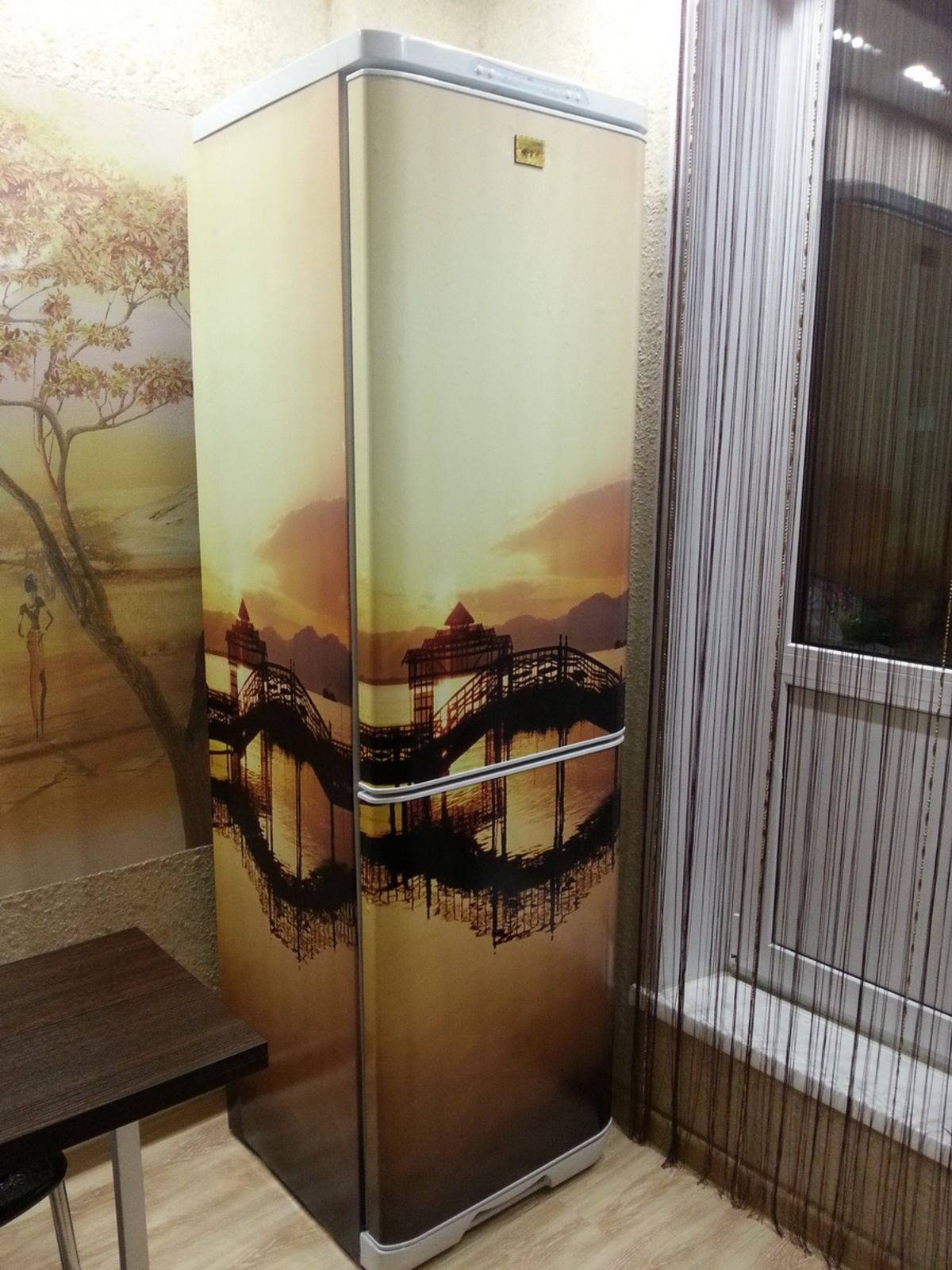 Переделка холодильника самоклеящейся пленкой – бюджетная и простая альтернатива фотопечати и покраске. Всё, что вам нужно сделать, чтобы сменить дизайн холодильника: обезжирить поверхность и снять ручки, приклеить пленку, попутно ровняя ее неострым плоским предметом, затем завернуть ее по краям, излишки обрезать и вернуть ручки на место. К сожалению, самоклеящаяся пленка в отличие от пленки с фотопечатью не имеет слоя ламинации и быстро истирается. Кроме того, она хуже ложится на неровные и округлые поверхности.