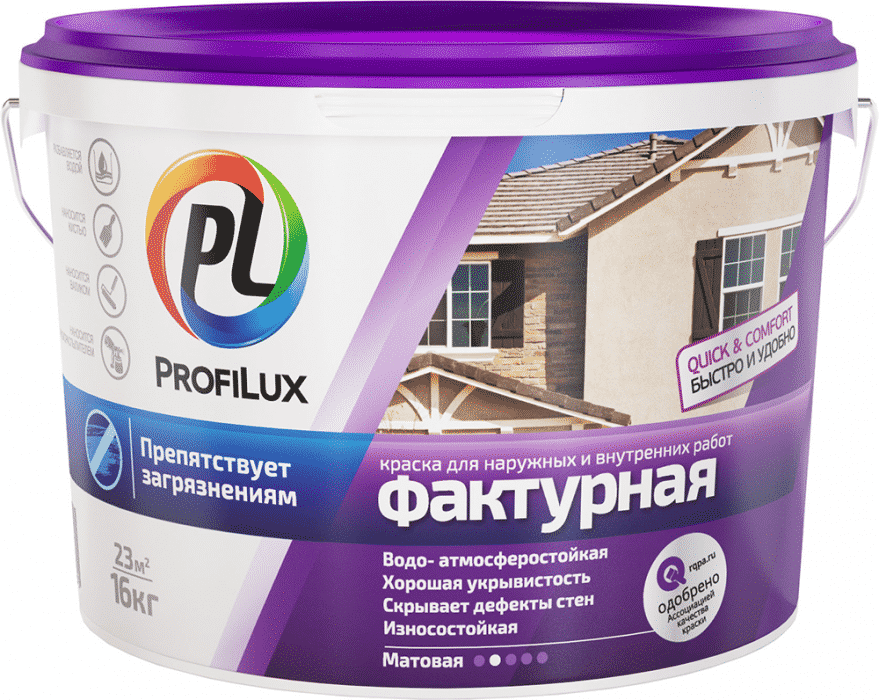 Для наружной отделки зданий следует выбирать фактурную краску, в состав которой включены специальные добавки, повышающие устойчивость покрытия к перепадам температур, ультрафиолетовому излучению и повышенной влажности. Акриловые составы выгорают на солнце, поэтому от них лучше отказаться, а вот виниловые смеси как раз подходят для окраски фасадов. Кроме того, можно применять силиконовые и силикатные фактуры.