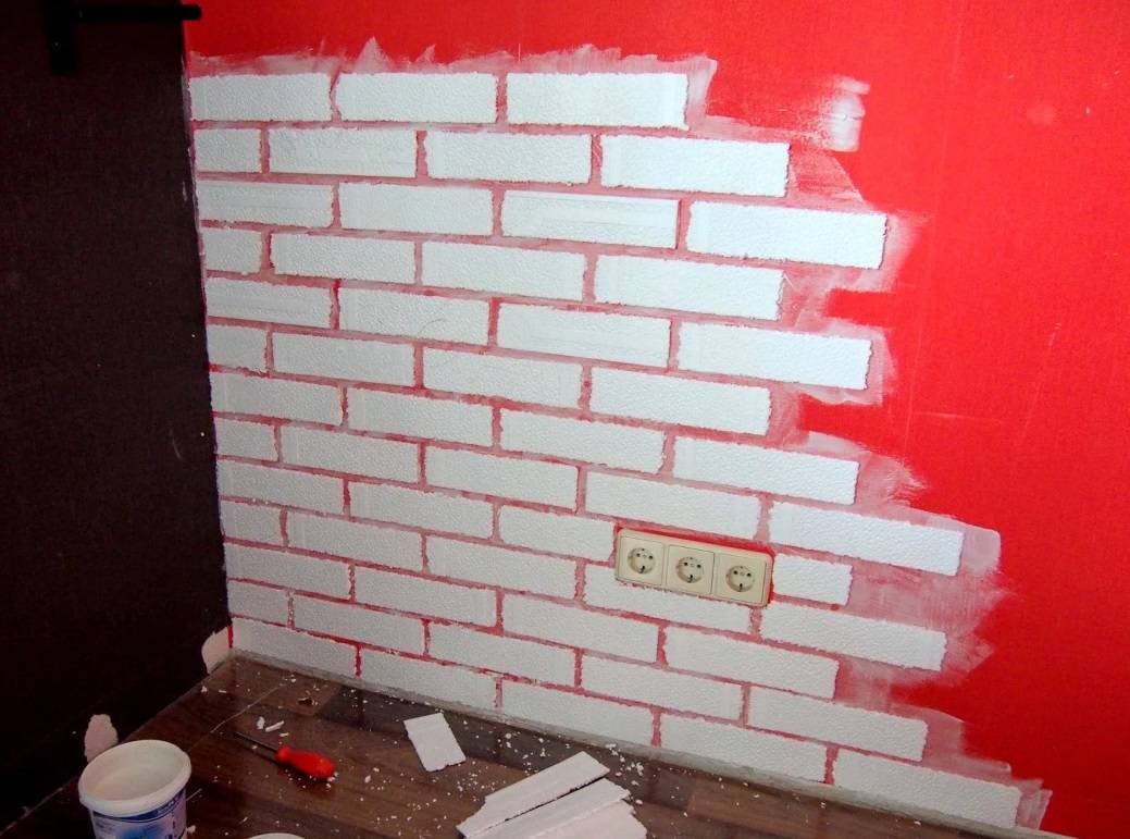 Особенность стены под кирпич из штукатурки в том, что создается новый объем, сохраняя площадь помещения. Если «кирпичная стена» монтируется из декоративного кирпича, пенопласта или керамической плитки, то сохранить полезную площадь однозначно не получится.