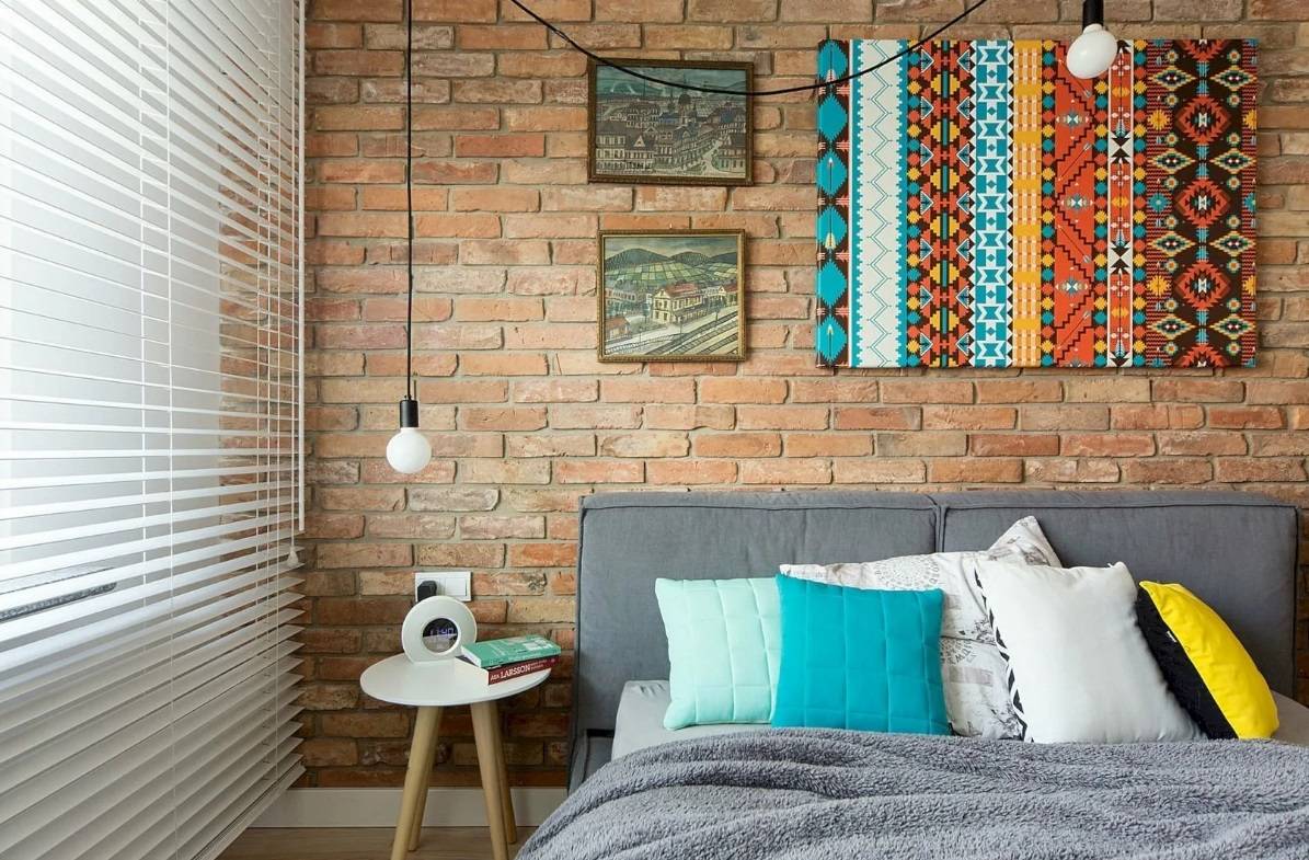 Спальня. Зона с кирпичиками в белом цвете в изголовье кровати придаст романтическое настроение.