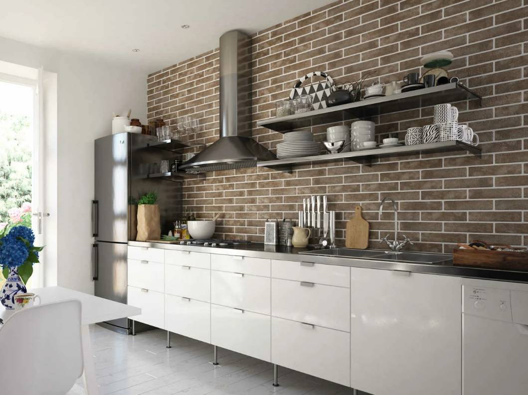 Стена под кирпич может быть использована в дизайне столовой, выделяя эту зону в самостоятельную. При стесненной площади на кухне, надо остановиться на кирпичиках в одном цвете