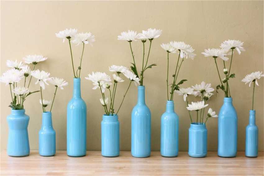 Простейший способ – декор стеклянных бутылок окрашиванием изнутри или снаружи. Для этого нужны прозрачные емкости разного объема. Если их выкрасить в один цвет, они будут выглядеть как сувенирный набор. Такие предметы можно соединять по 2-3, образуя «дуэты» и «трио». Лучше всего использовать декорированные бутылки в качестве вазонов под сухую икебану или искусственные цветы.