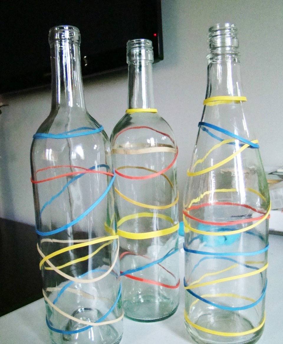 Теперь будем декорировать бутылку снаружи. Удаляем этикетки и наматываем на корпус бутылки резинку шириной не менее 5 мм – в виде спирали или в произвольном порядке.