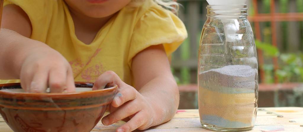 Насыпаем соль в термостойкую посуду, добавляем акриловую краску и перемешиваем, разминая получившуюся кашицу вилкой. Помещаем смесь в духовку (100 градусов), через час достаем, вновь разминаем вилкой и просеиваем через сито. Получается нечто похожее на цветной песок. Таких «песков» делаем несколько видов – разных цветов.