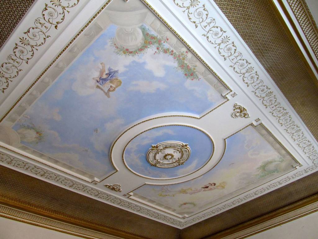 Расписанная вручную потолочная поверхность смотрится очень красиво, стоит лишь вспомнить великолепные сводчатые потолки с фресками кисти мастеров эпохи Возрождения. Такую отделку невозможно игнорировать, особенно когда к её созданию приложил руку профессиональный художник. Останавливает в этом случае лишь одно – цена вопроса. Услуги мастера стоят соответствующе.