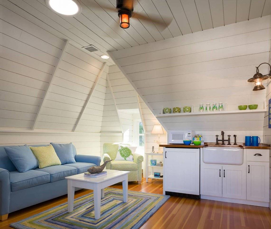 Для создания расслабленной обстановки можно выбрать классическую вагонку на потолок и выкрасить её в тон стен. Иллюзия совмещённых плоскостей будет гармонично перекликаться с ощущением натуральности. Всё вместе это смотрится эстетично и атмосферно.