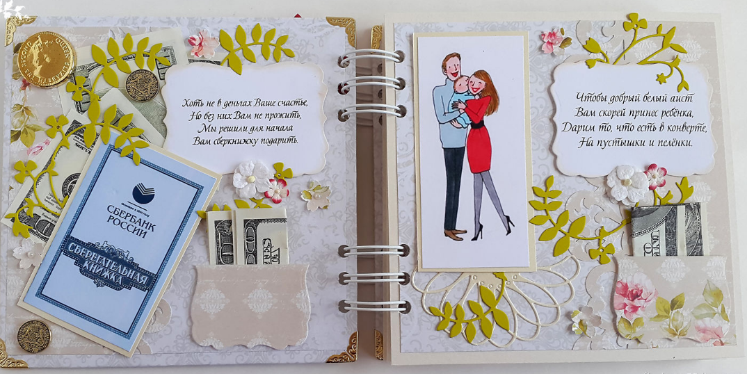 Оригинальный способ вручить денежную сумму молодоженам ― подарить самодельную свадебную сберкнижку с подтекстом. Ее можно сделать по шаблону из интернета или заказать на сайтах с продукцией hand made. На каждой страничке крепите купюру и пишите, на что ее можно потратить.