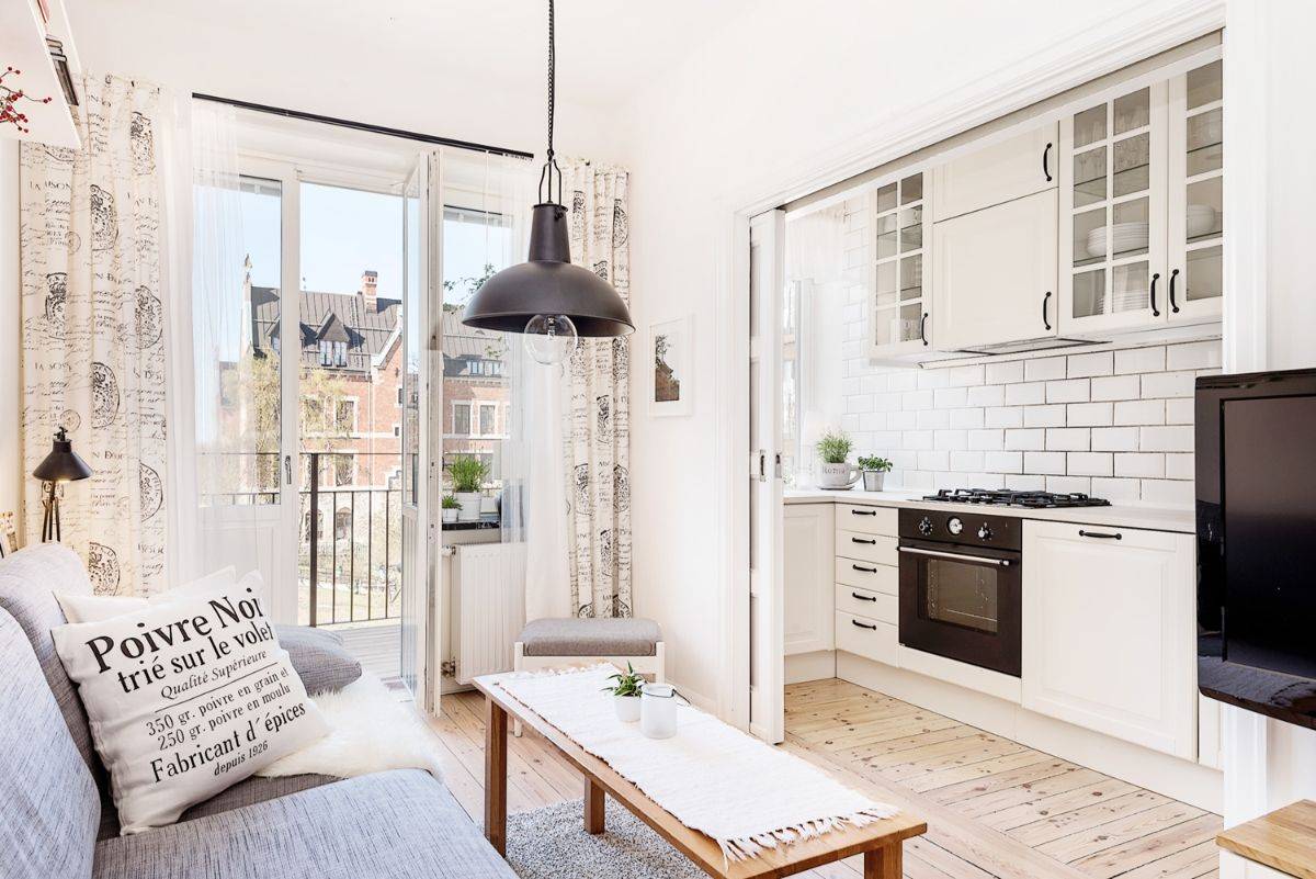 Кухня-гостиная 17 кв м в скандинавском стиле выглядит уютной и объемной за счет применения светлых оттенков и натуральных материалов. Для отделки стен выбирают белый цвет, применяют белоснежную керамическую плитку для оформления фартука, деревянную столешницу для кухонного гарнитура и обеденного стола. Мебель на конусообразных ножках, в декоре плетеные корзины, ротанговые аксессуары, плед и подушки на диваны, черная фурнитура на кухне и светильники на длинных ножках.