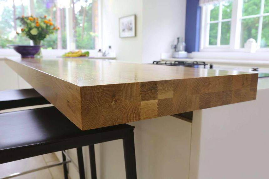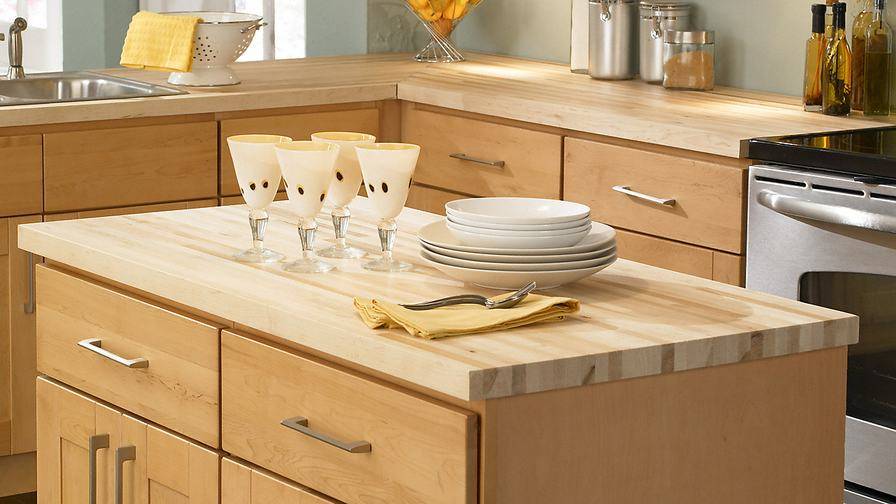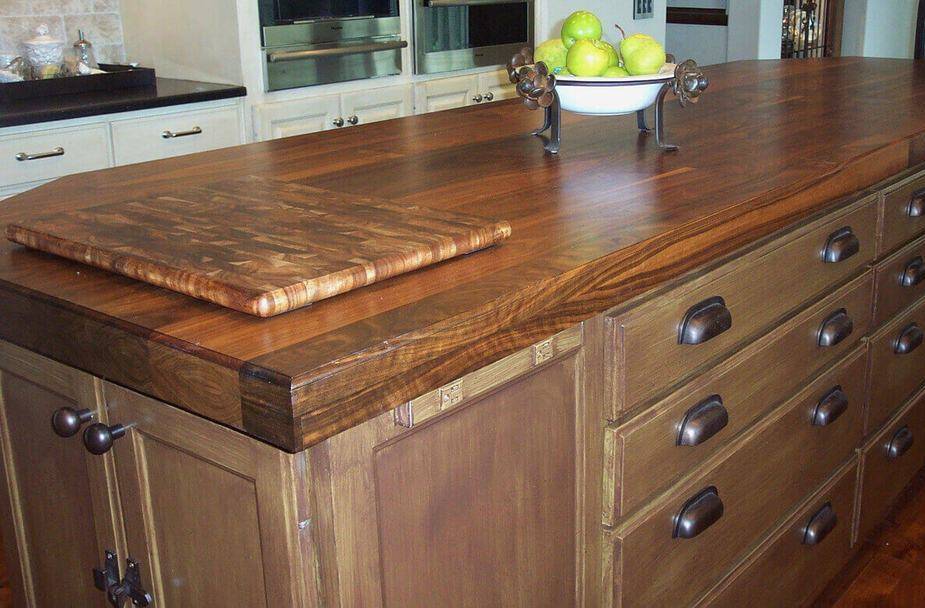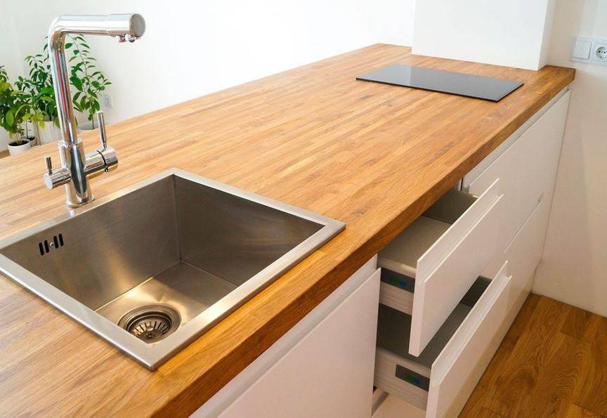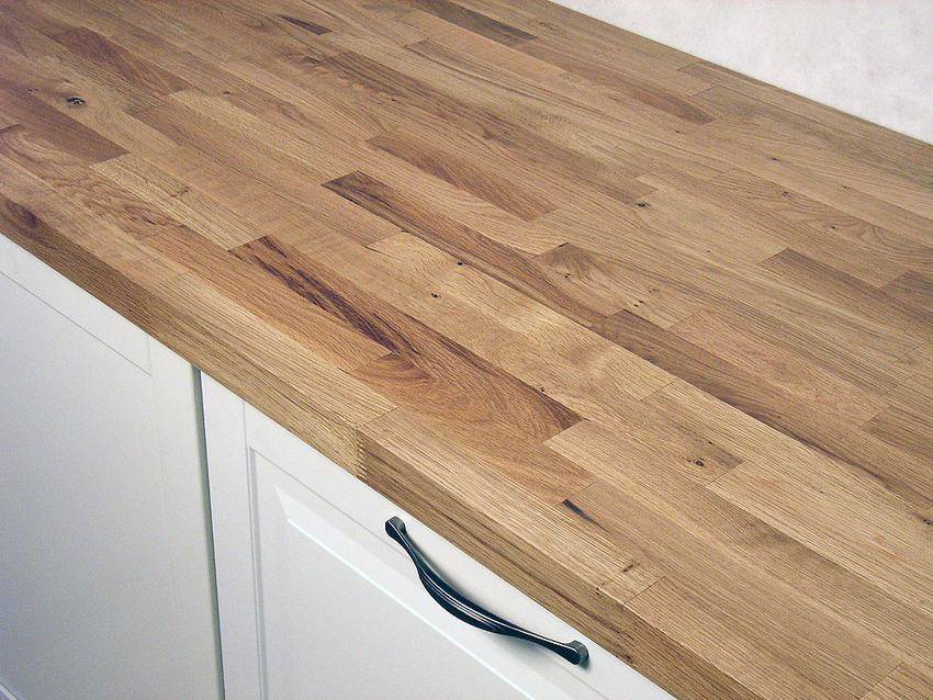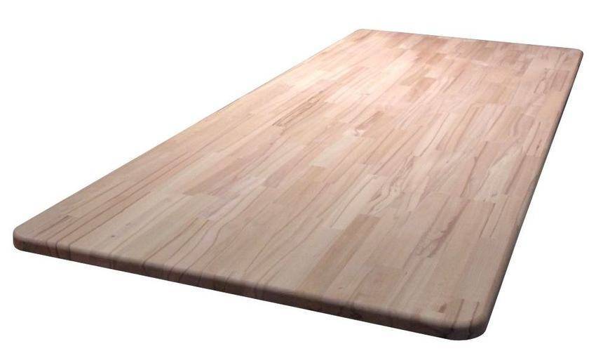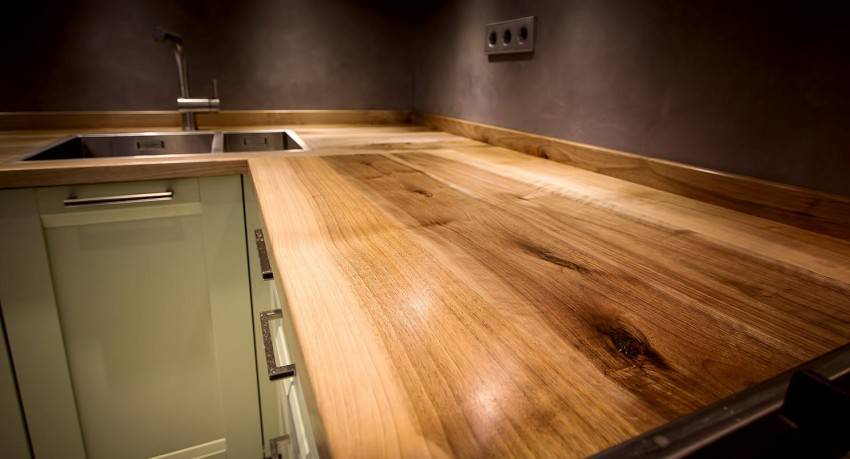 Чтобы на столешницу можно было ставить тяжелую утварь, ее толщину выбирают не меньше 25 мм. Лучшими по сочетанию твердости и устойчивости к негативным воздействиям признаны изделия из дуба, тика, ореха, вишни, черешни, мербау. Помимо породы древесины, на качество влияют вид покрытия и состав клея.