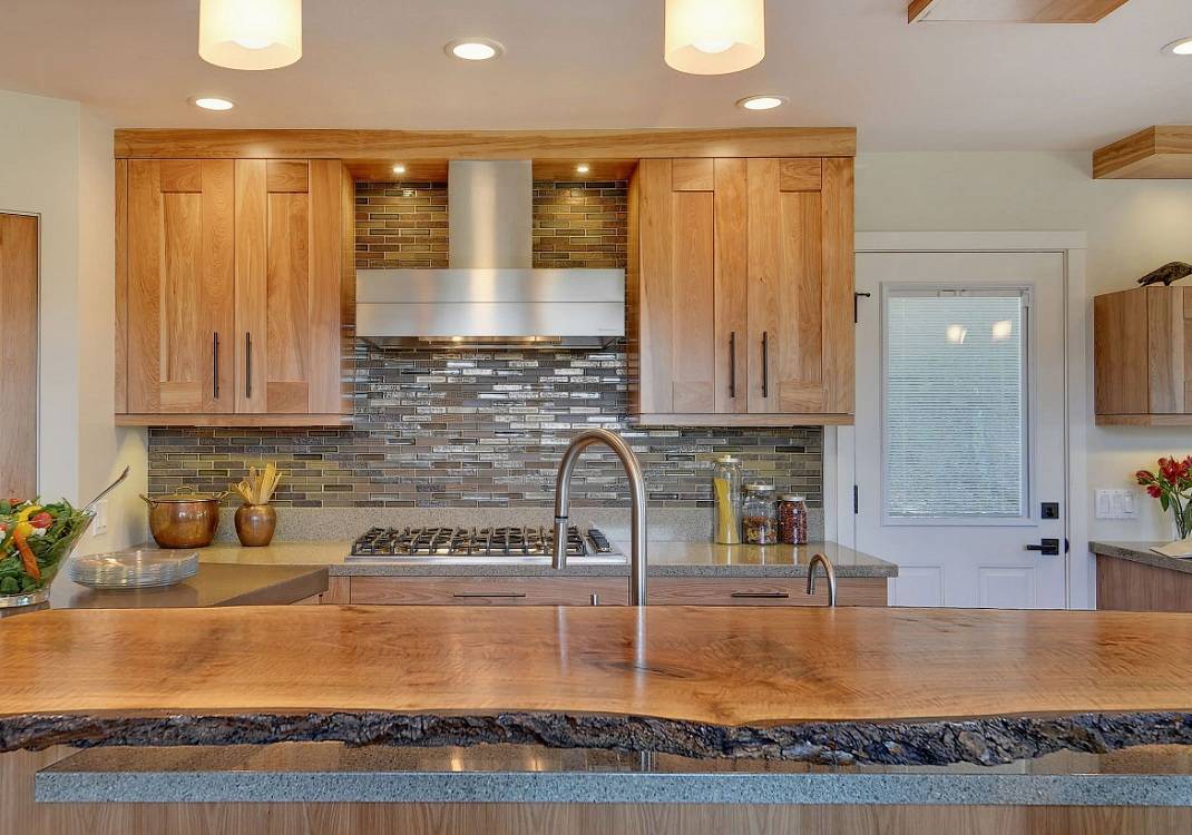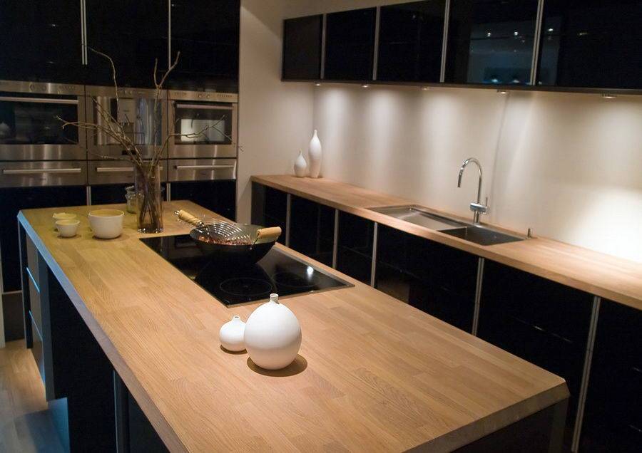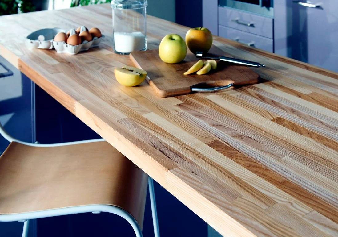 Независимо от породы, дерево должно быть хорошо просушенным, с влажностью не выше 12%. Доски с червоточинами, смоляными карманами, гнилыми сучками отбраковываются. Поскольку для кухни характерен высокий уровень влажности, выбирается влагоустойчивая древесина или обработанная водоотталкивающим составом. Лучшим материалом по этому параметру являются доски из лиственницы, дуба, березы, сосны, ели. Сторонникам экологической чистоты понравятся столешницы, сделанные из цельной доски. Оригинально выглядит поверхность древесин ироко и венге, обладая при этом высокими эксплуатационными качествами. Однако следует учитывать, что вариант из массива обойдется дороже, а со временем может деформироваться.