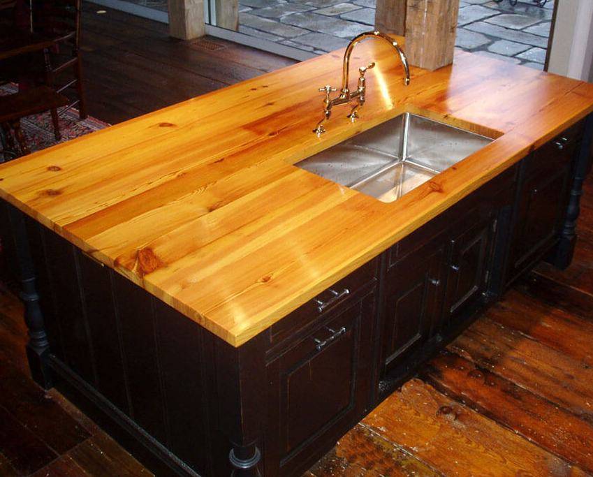 Чрезвычайно популярны столешницы из древесины сосны. Они обладают характерным ярким узором и текстурой. Сосновая древесина не боится влажности.