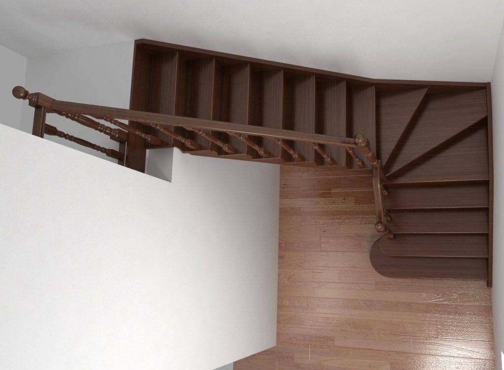 С забежными ступенями. Вариант для еще большей экономии пространства, чем в первом случае. Поворот изделий осуществляется не при помощи площадки, а за счет сужающихся к центру угла ступеней.