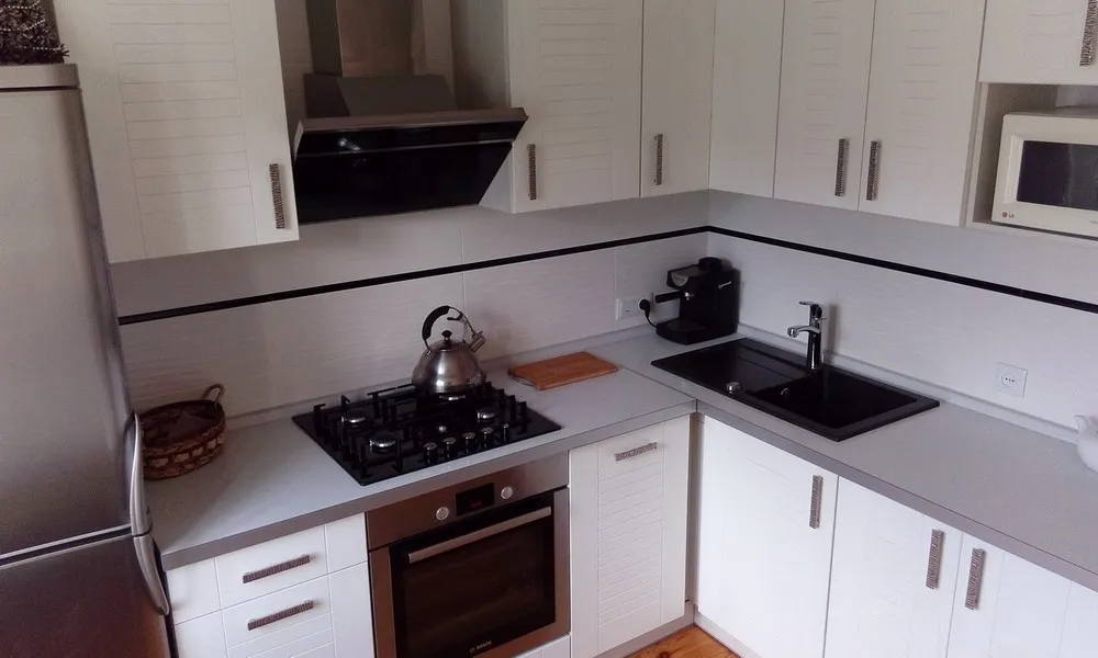 Часть стены в рабочей зоне отделывают керамической плиткой; обычно это пространство между верхними и нижними шкафами гарнитура. Если бюджет ремонта ограничен, фартук оформляют пластиковыми, или МДФ-панелями. Стыки панелей нужно защитить от влаги специальными накладками.