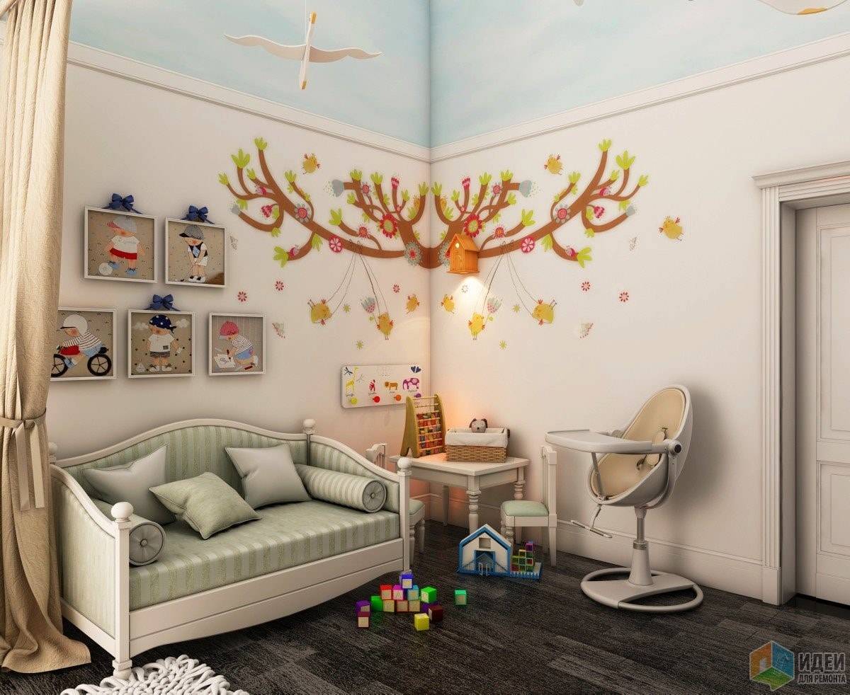 Возраст. Оформляя детскую для новорожденного, не впадайте в крайности. Пестрое оформление с яркими цветовыми акцентами будет утомлять неокрепшую психику. Белое или очень светлое пространство будет тормозить развитие — мозг крохи развивается быстрее при созерцании разных цветов. Идеальным выбором станет пастельная гамма отделки, декора и текстиля. В большом количестве яркие цвета в детской появятся, когда ребенку исполнится 3-4 года.