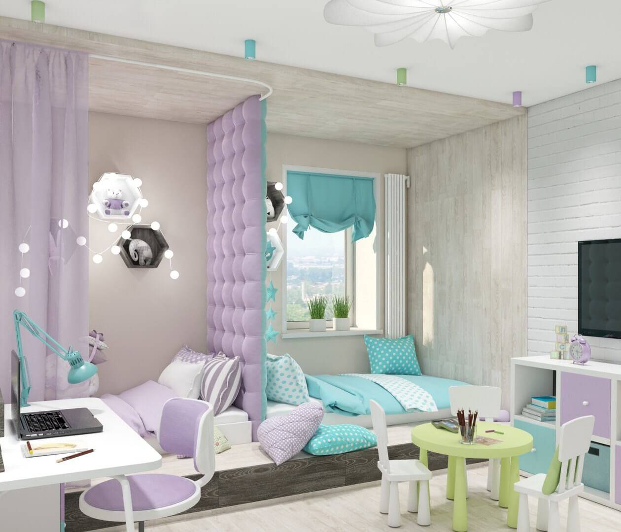 каждая зона должна быть чётко разделена визуально или фактически. Такой подход необходим для обеспечения чувства комфорта у детей. Например, для мальчика и девочки старшего дошкольного возраста можно установить двухъярусную кровать, а область для игр и развивающих занятий отделить лёгкой перегородкой. Таким образом, отдых будет более спокойным, ведь дети не будут отвлекаться на игрушки;