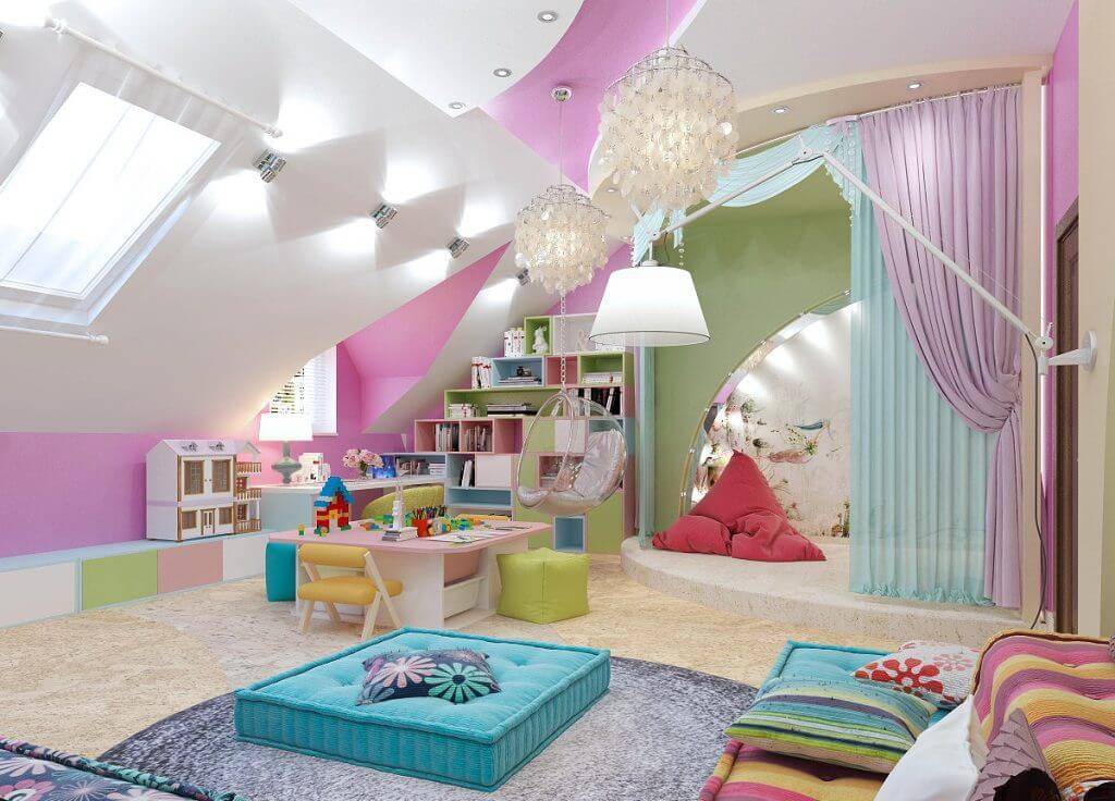 - выбор цвета. Разных оттенков в помещении должно быть не более трех. Девочки отдают предпочтение розовым, лиловым или фиолетовым оттенкам. Эти тона могут быть основными и предназначаться для самых больших поверхностей в помещении. Дополнением к ним выбирается нейтральный оттенок (бежевый, молочный, светло-серый). Эти тона благоприятно влияют на детскую психику и делают комнату визуально просторнее и светлее. Чтобы поделить комнату на зоны, выбираются два любимых оттенка девочек. Главное, чтобы эти цвета хорошо сочетались друг с другом. Удачным примером станет сочетание розового и зеленого, голубого и лимонного, лаймового и оранжевого оттенков.